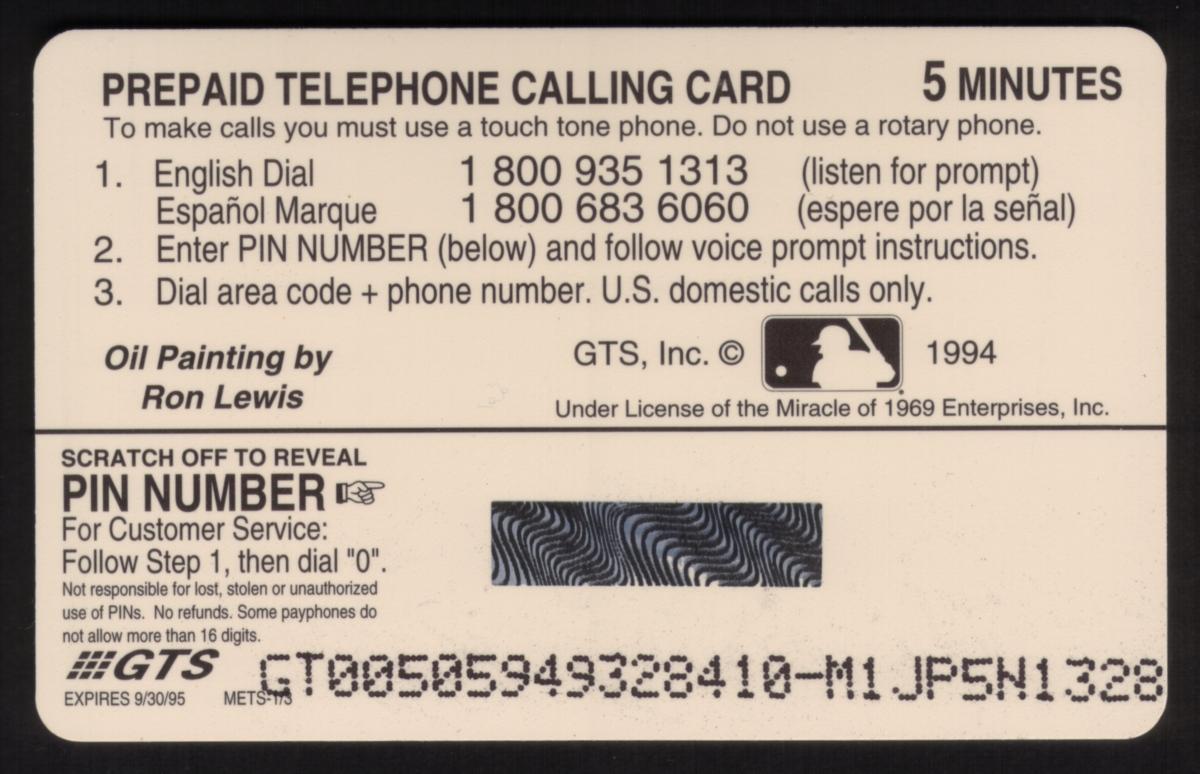 This collectible phone card is issued by Global Tel. Solutions and is part of a series celebrating Major League Baseball, specifically highlighting iconic players from the 1969 Mets team. It captures the spirit of the Miracle Mets' legendary championship season through vibrant artistry and team branding.