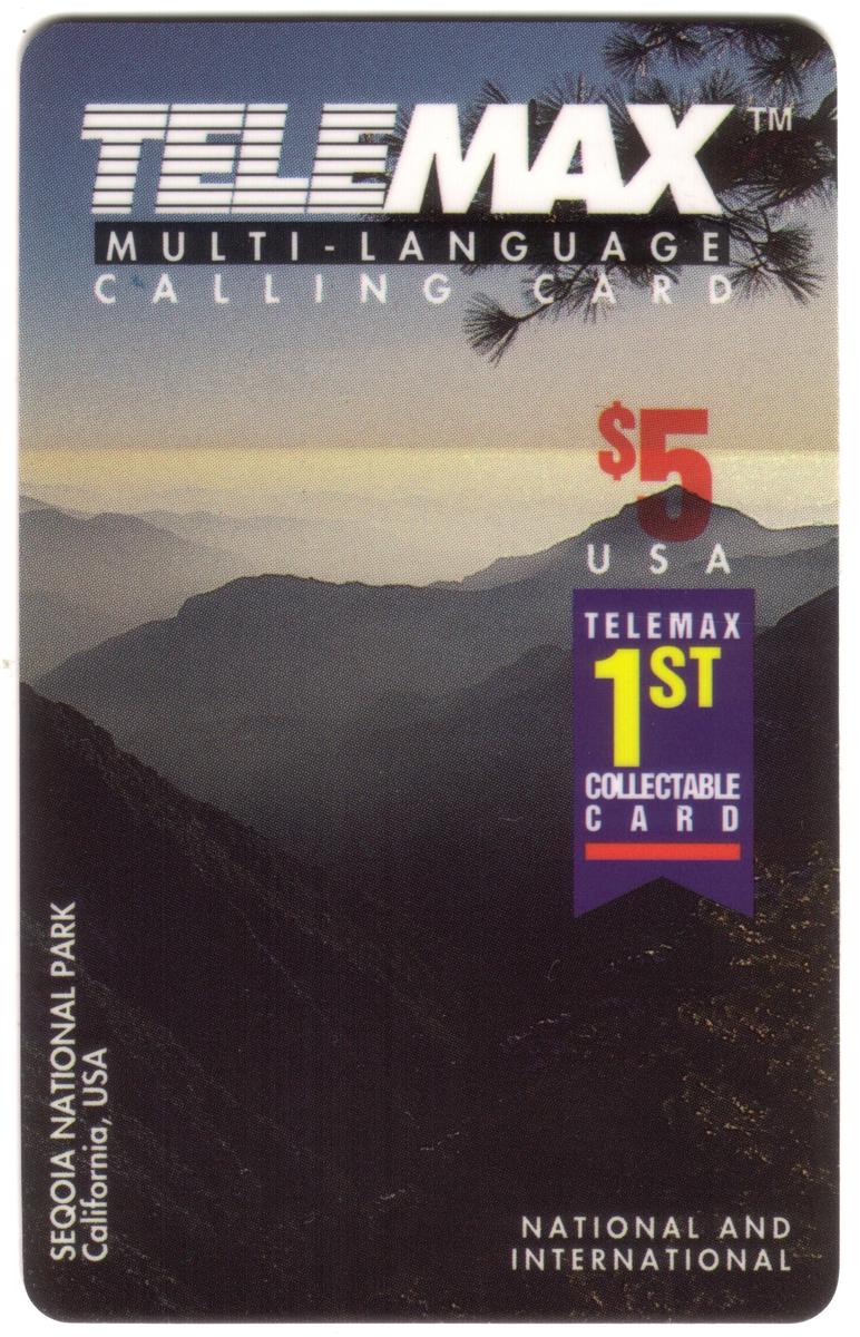 The card’s text identifies it as part of a series related to national parks and scenic travel destinations, specifically naming Sequoia National Park. The issuing entity shown is Telemax Communications, which is clearly printed on the card face. The card’s value is indicated as $5. The front also includes relevant keywords such as California, trees, mountains, nature, and sightseeing, emphasizing the card’s focus on natural scenery and travel.