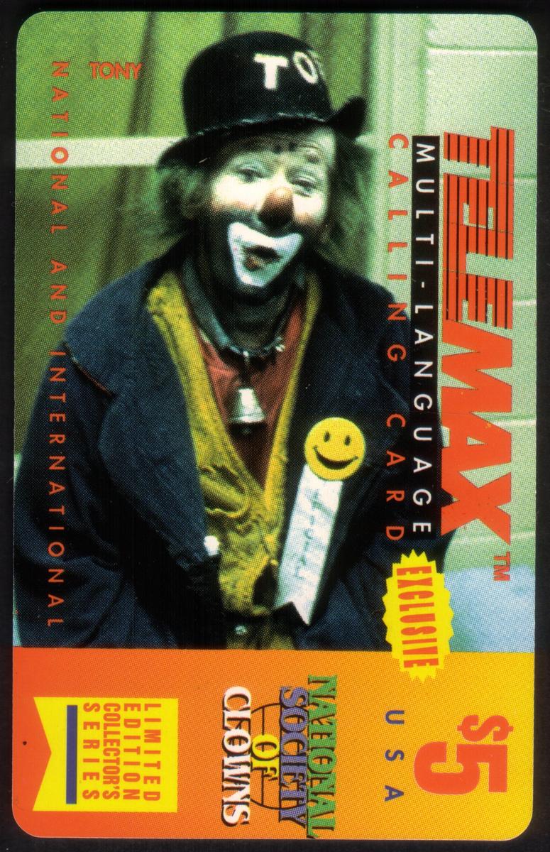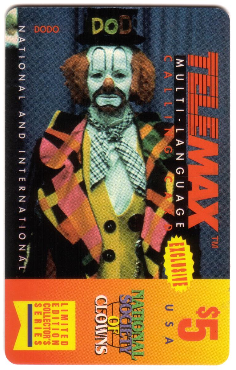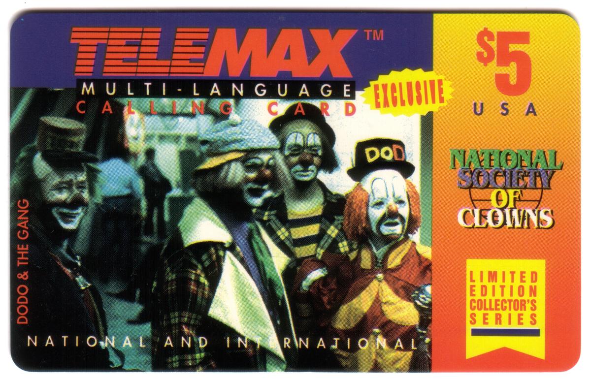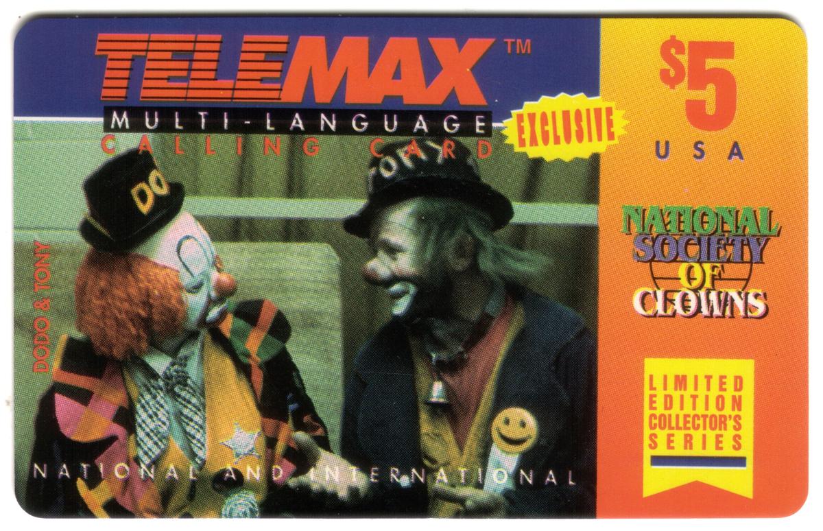 This set of five Telemax multi-language calling cards features images of clowns associated with the National Society of Clowns. Each card is valued at $5 USD and is part of a limited edition collector’s series. The cards prominently display the Telemax logo in red and orange, with "EXCLUSIVE" marked in a yellow burst, alongside the text "$5 USA" and “NATIONAL SOCIETY OF CLOWNS” in green and gold lettering. The phrase "LIMITED EDITION COLLECTOR'S SERIES" appears in a yellow box beneath the society's name on each card.