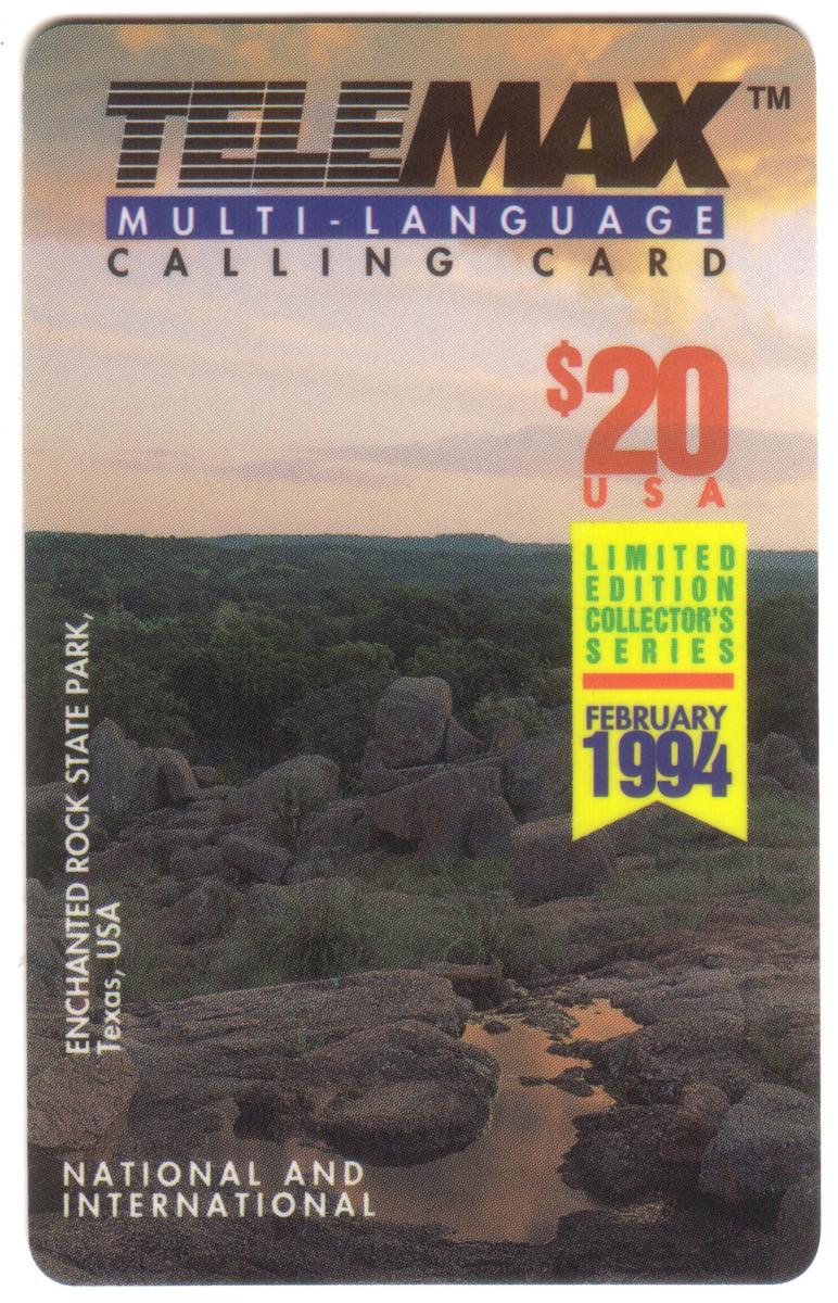 Along the top of the card, the text reads "Enchanted Rock State Park" with "Texas" positioned nearby, providing clear identification of the location. The card includes a $20 value prominently displayed in the upper right corner, indicating its worth for telephone use. A logo for Telemax Communications is present, tying it to the service provider responsible for the card.