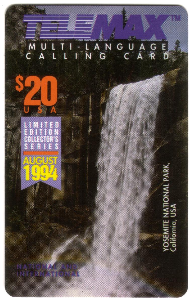 The card has a denomination of $20, clearly marked, which indicates its value for use as a phone card. The issuer is Telemax Communications, whose name is printed on the card. Additional text includes “Yosemite National Park, California (August 1994)” to specify the location and date of the photograph. The card design incorporates the WorldCom logo in the upper right corner, linking it to the WorldCom telecommunications network.