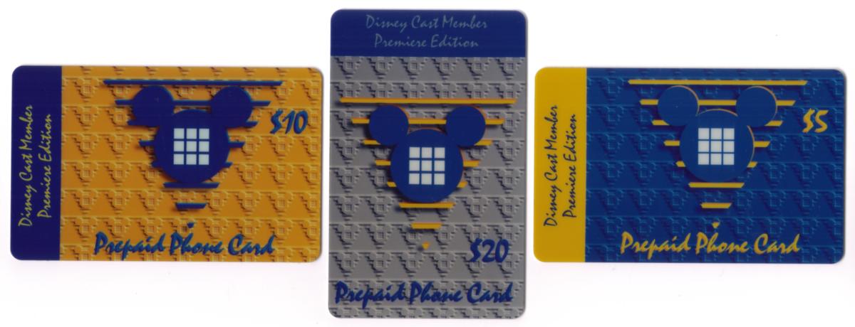 Set of three 1994 Disney Cast Member Premiere Edition prepaid phone cards with Mickey ears design, embossed pattern, vibrant colors, and collectible appeal. |