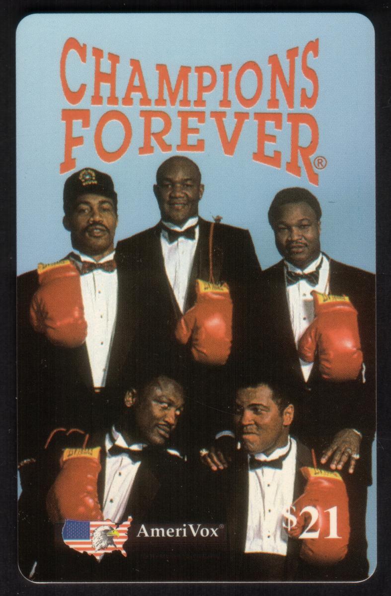 Champions Forever phone card featuring iconic boxers Ken Norton, George Foreman, Larry Holmes, Muhammad Ali, and Joe Frazier in formal attire with red gloves. |