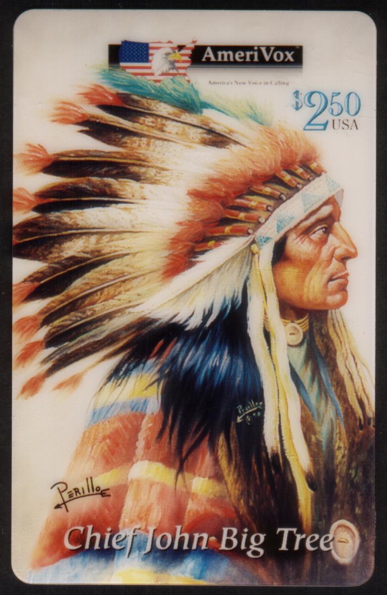 The third card presents a detailed profile portrait of Chief John Big Tree wearing a traditional feathered headdress with many colors including white, red, and blue feathers. He has long hair and wears traditional adornments around his neck. The background is a neutral light tone, enhancing the focus on the chief’s face and headdress. The artist’s signature appears near the bottom left, and "Chief John Big Tree" is printed beneath the image.