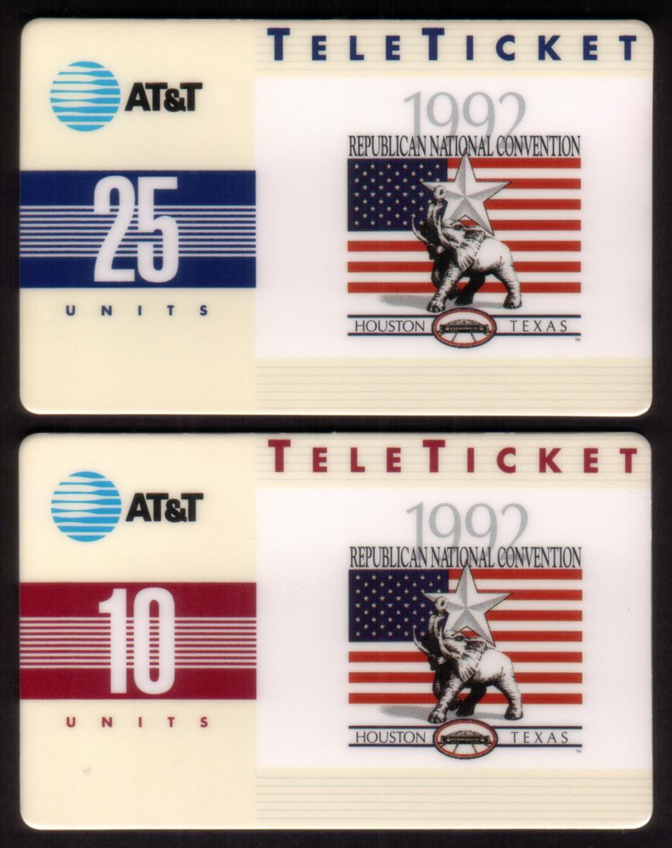 Pair of 1992 AT&T TeleTicket phone cards featuring Republican National Convention imagery, patriotic symbols, and varying call unit values, reflecting political and telecom history. |