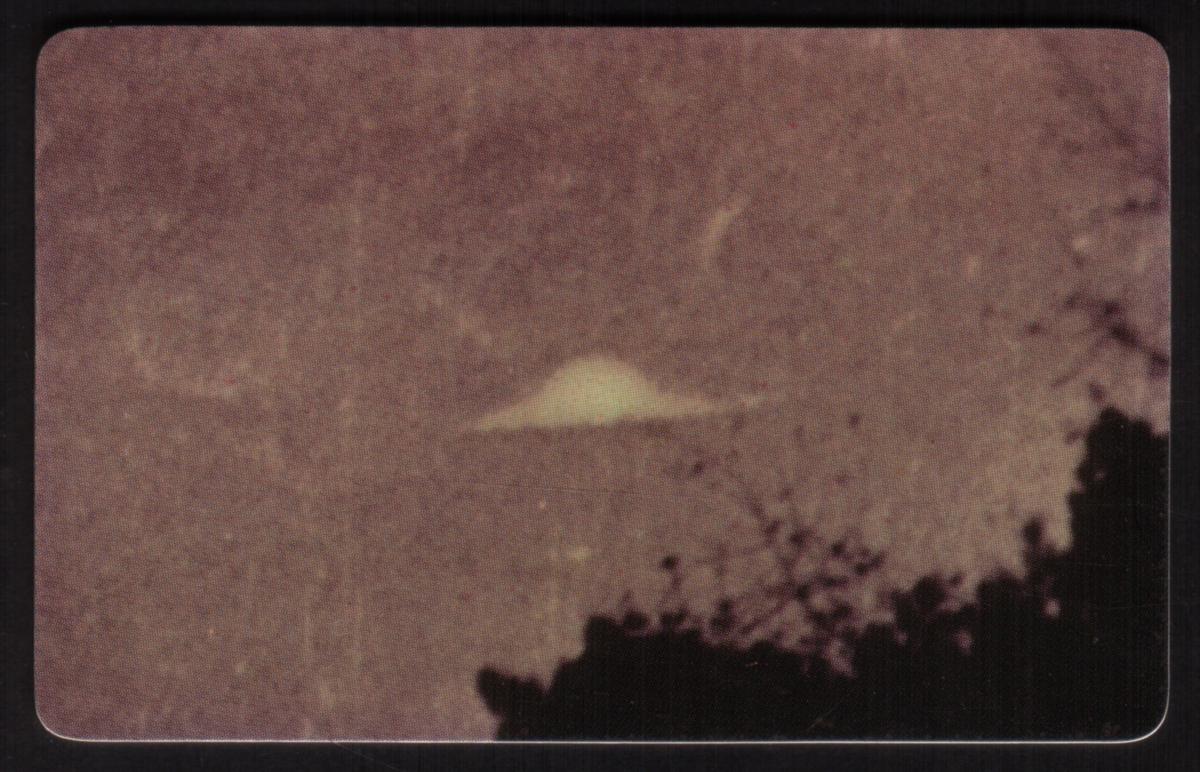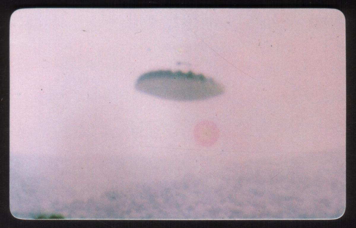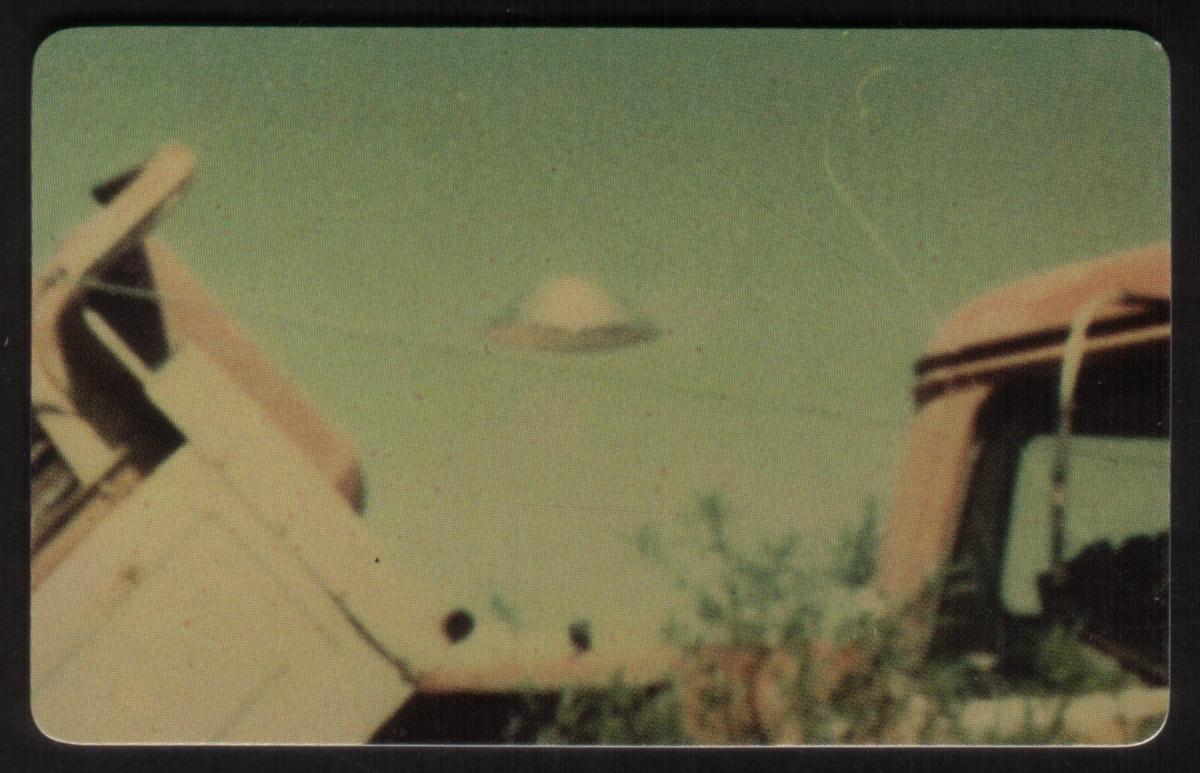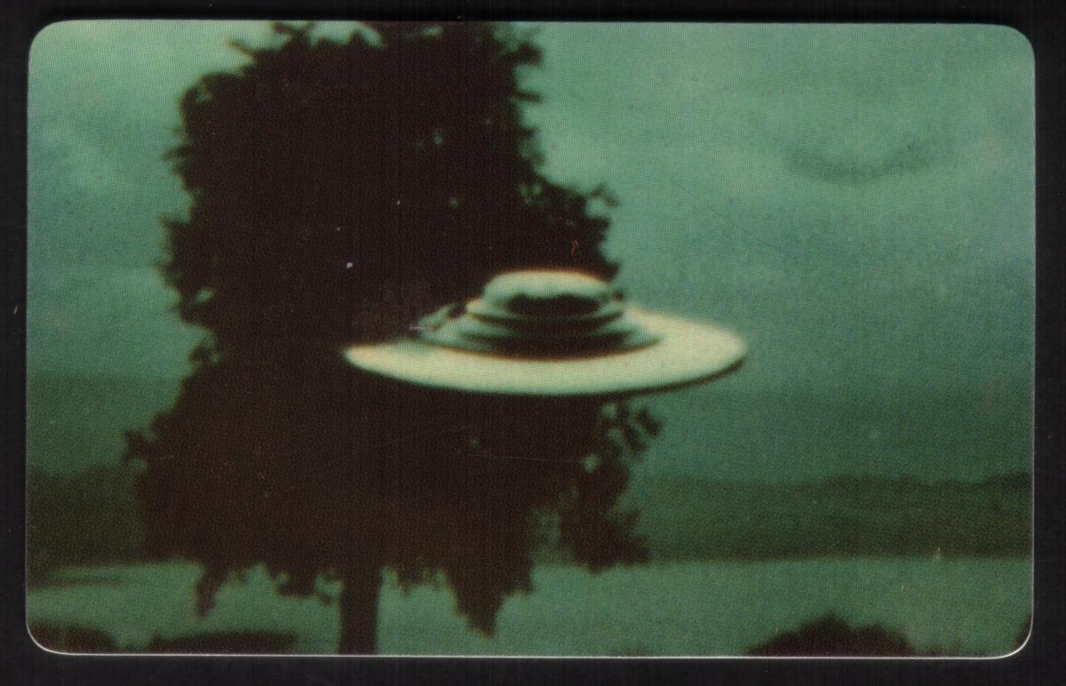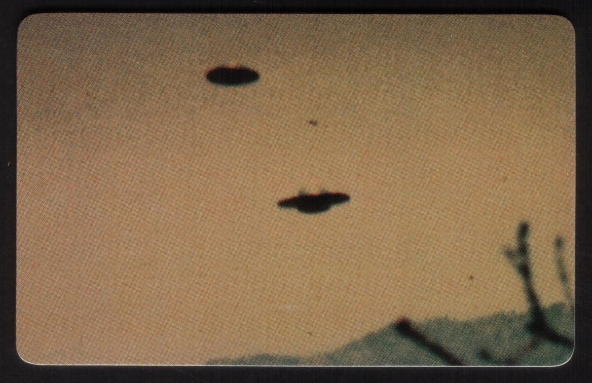 The composition captures a mysterious mood typical of paranormal and outer space collectibles. The card’s graphic elements are arranged to draw attention to the theme of alien encounters and unidentified flying crafts, making it a compelling item for collectors interested in space phenomena and UFO history from around the world.