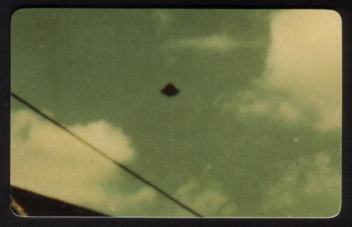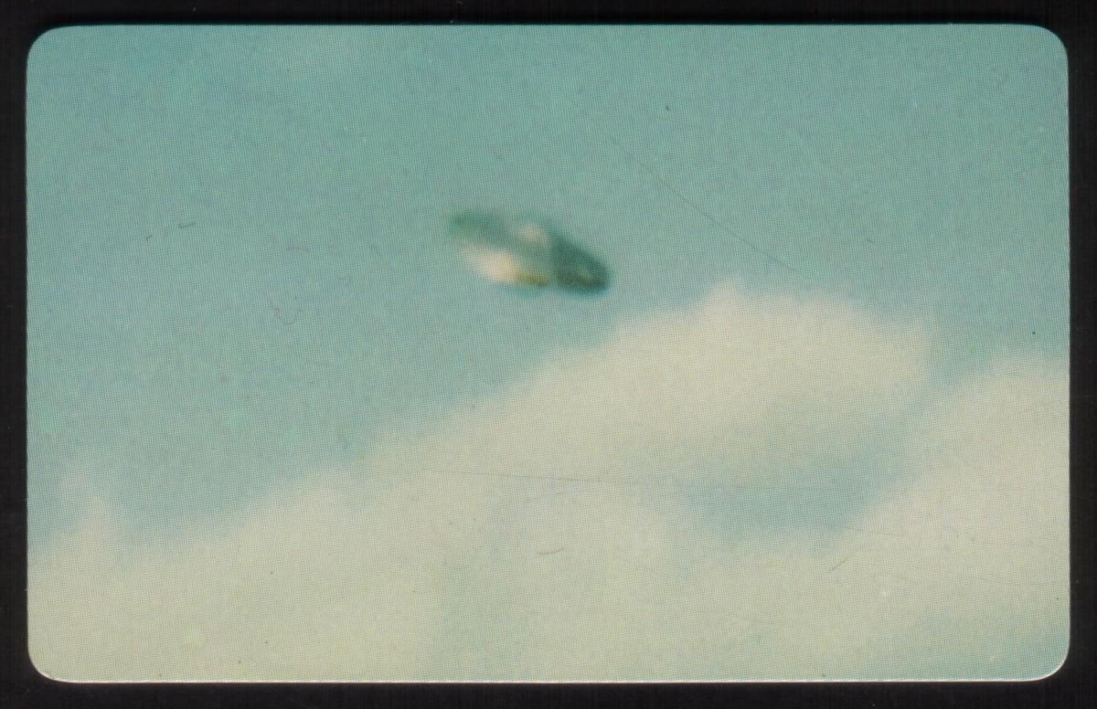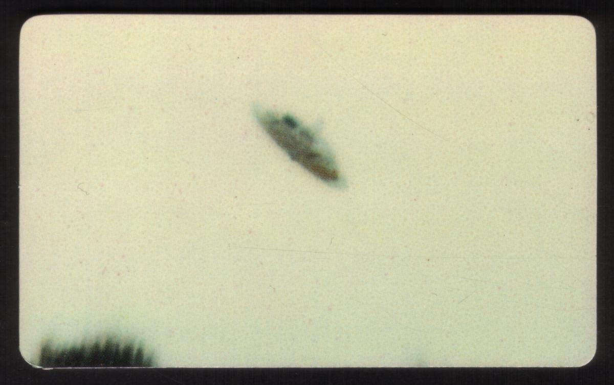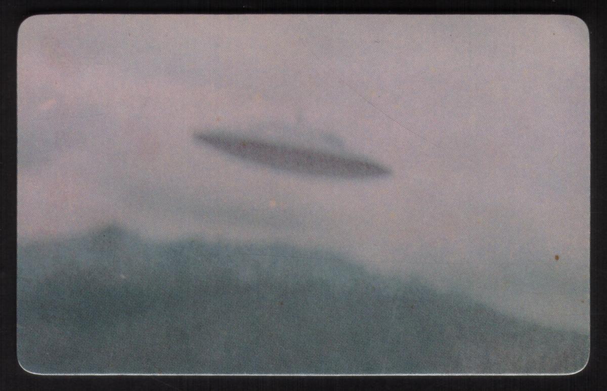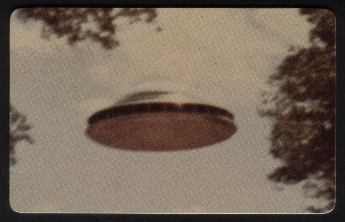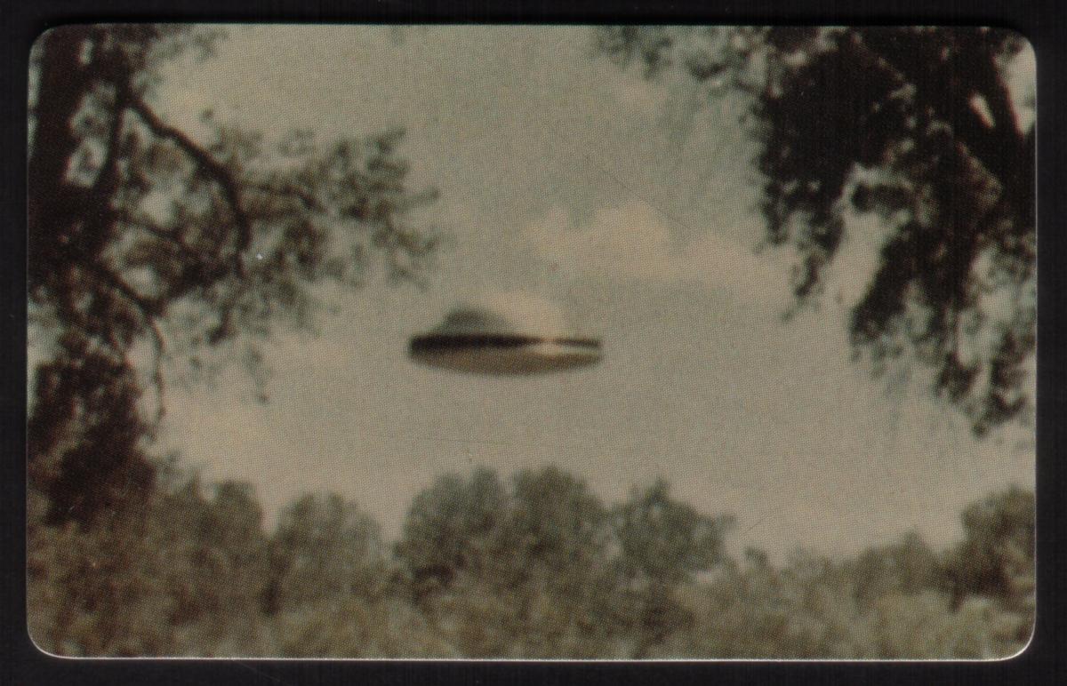 The composition captures a mysterious mood typical of paranormal and outer space collectibles. The card’s graphic elements are arranged to draw attention to the theme of alien encounters and unidentified flying crafts, making it a compelling item for collectors interested in space phenomena and UFO history from around the world.