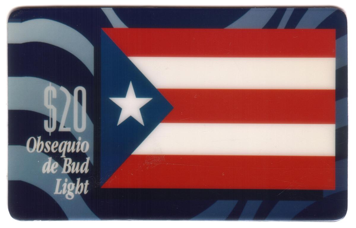 Puerto Rican flag phone card with vibrant colors, patriotic design, $20 value, Bud Light promotion, modern blue background, collectible and functional. |