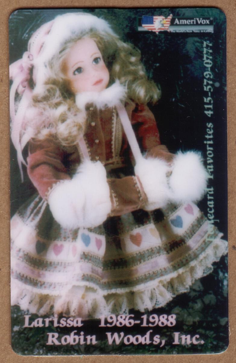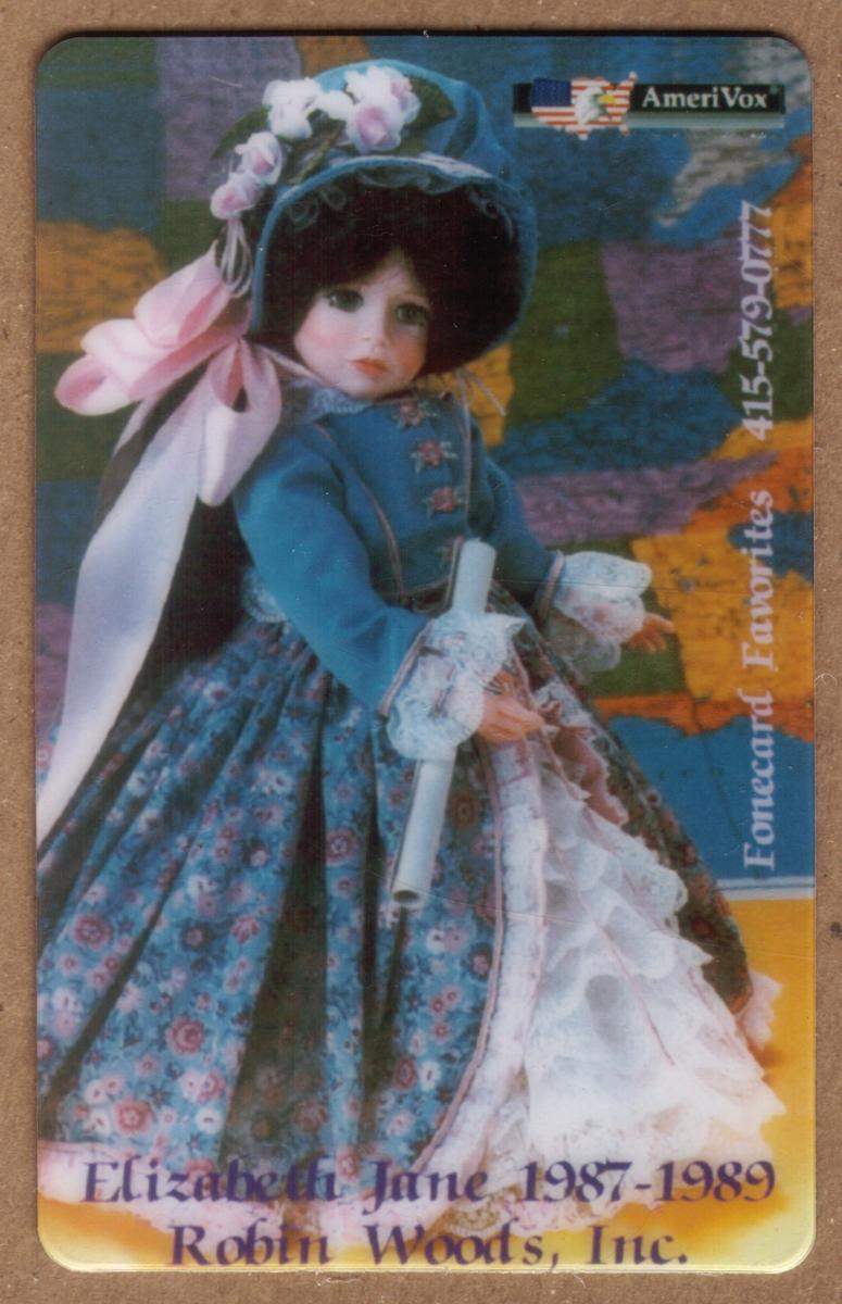 The card also prominently shows the AmeriVox logo and AVX branding, identifying it as part of the AmeriVox Fonecard series. The text includes "Robin Woods, Inc." which is associated with the production or distribution of this collectible phone card set. The composition focuses on the collectible nature of the dolls, combining nostalgic artistic depictions with branding elements that appeal to collectors.