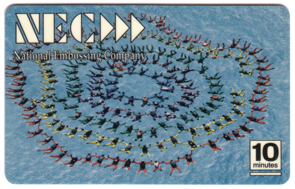 This collectible phone card features a vibrant image of six people skydiving in freefall. Each skydiver wears a parachute rig with brightly colored helmets and jumpsuits. They form a symmetrical ring while holding hands, demonstrating a classic skydiving formation. The parachutes themselves are not yet deployed, emphasizing the moment of aerial teamwork and coordination.