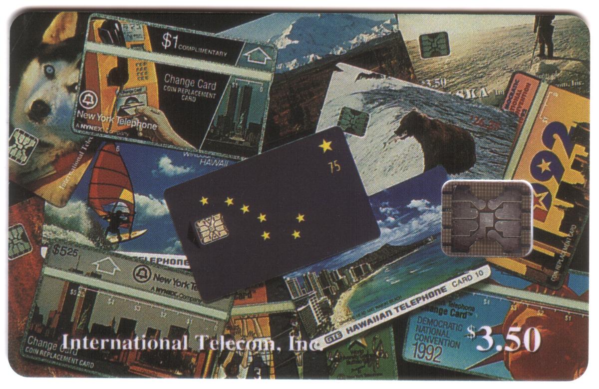Prominently featured in the collage is a chip card with the Alaska state flag design, displaying the Big Dipper constellation and a star, marked with the number 75. Other chip cards show a wide variety of images, including a red windsurfer, a telephone coin replacement card, and a card with the text "$1 Complimentary." The card prominently states a value of $3.50 and includes the name “International Telecom, Inc.” at the bottom center.