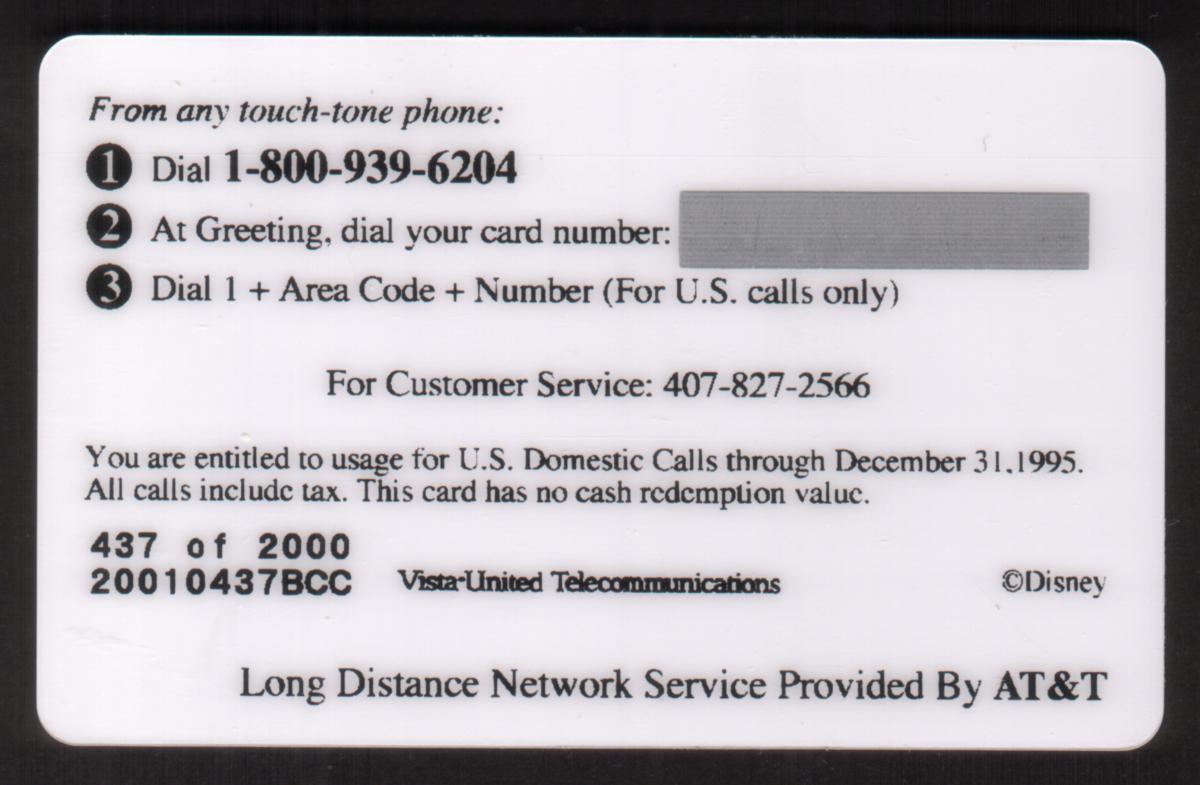 The card is issued by Vista-United (Disney) and carries branding related to AT&T, connecting it to telecommunications services around that time. The style and labeling clearly identify this as a collectible phone card tied to Disneyana, a convention celebrating Disney collectibles and animation history.