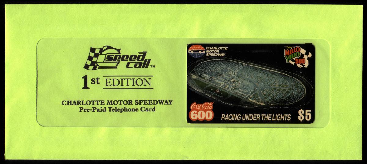 Charlotte Motor Speedway themed prepaid phone card featuring night race scene, logos, and racing icons, encapsulating NASCAR history and racing culture. |