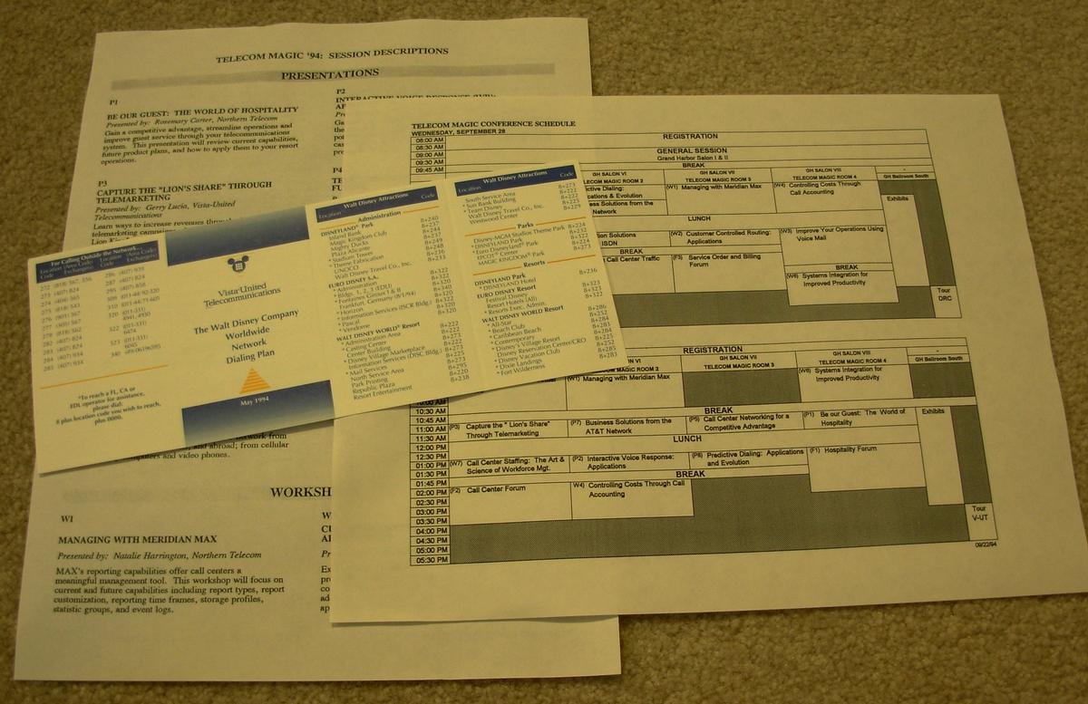 At the upper area of the card, the text reads “Telecom Magic Conference” alongside “Vista-United,” indicating the card’s connection to a professional development conference related to telecommunications. The card references Walt Disney World and Walt Disney Land, linking it to the famous theme parks and amusement parks associated with Disney animation and cartoons.