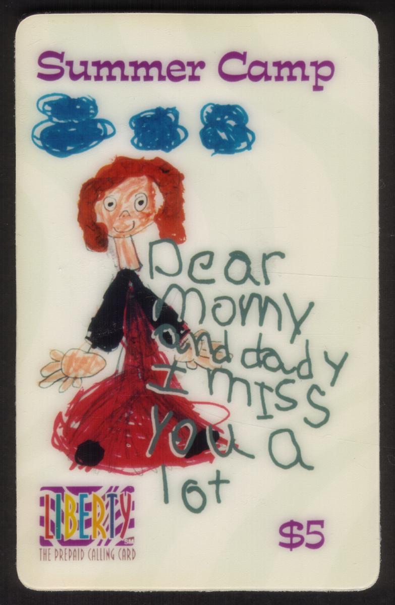 Text on the card identifies it as a $5 Summer Camp collectible item. Additional printed details show it is associated with the Quest Group International. The style, text, and overall design align closely with the “Art - Cartoons, drawings, children’s drawings, camping” keywords connected to SKU-10488.