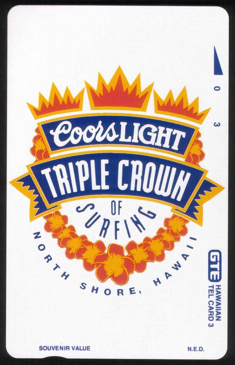 This set of three collectible GTE Hawaiian Telephone Tel Cards celebrates the Coors Light Triple Crown of Surfing, set on the North Shore of Hawaii. The first card features the Coors Light Triple Crown of Surfing logo prominently in the center, with stylized text framed by a crown and a ring of hibiscus flowers. The text below the circular logo reads “North Shore, Hawaii.” The card background is white, with the GTE Hawaiian Tel Card 3 logo shown vertically along the right edge in blue. The bottom left corner states “Souvenir Value” with the initials “N.E.D.” in the bottom right.