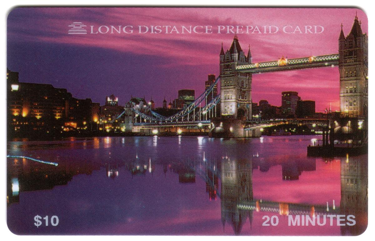 No additional characters or names are visible on the card itself. The overall design emphasizes the well-known London Bridge as a symbol of the city’s historical and architectural significance, making this phone card a collectible item for those interested in London landmarks and cityscapes.