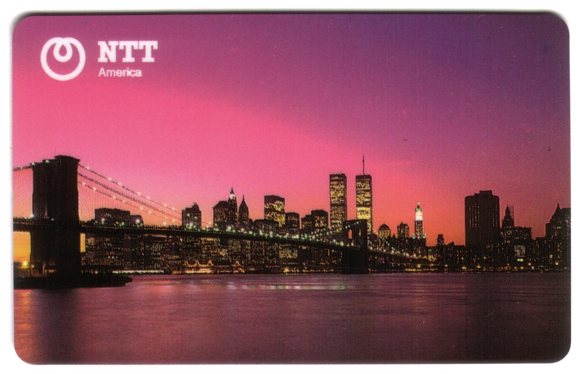 This collectible phone card features a photographic image of the Brooklyn Bridge in New York City, prominently showcasing the iconic suspension bridge structure with its cables and stone towers. The skyline of Manhattan is visible in the background, including the World Trade Center Twin Towers. The card includes printed text indicating a value of $10 and displays the label "WTC $10." The card also carries information referring to NTT and America, linking it to telecommunications.