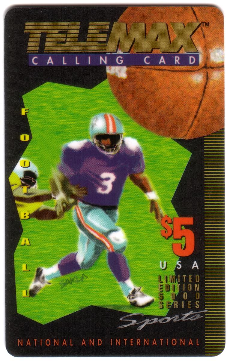 The overall color scheme is dominated by blue tones, complementing the white and brown of the football illustration. The card’s design is clean and modern, combining elements of art and sports memorabilia. The presence of Telemax Communications and WorldCom, alongside the football art, identifies this piece as an official collectible within a sports-themed phone card series.