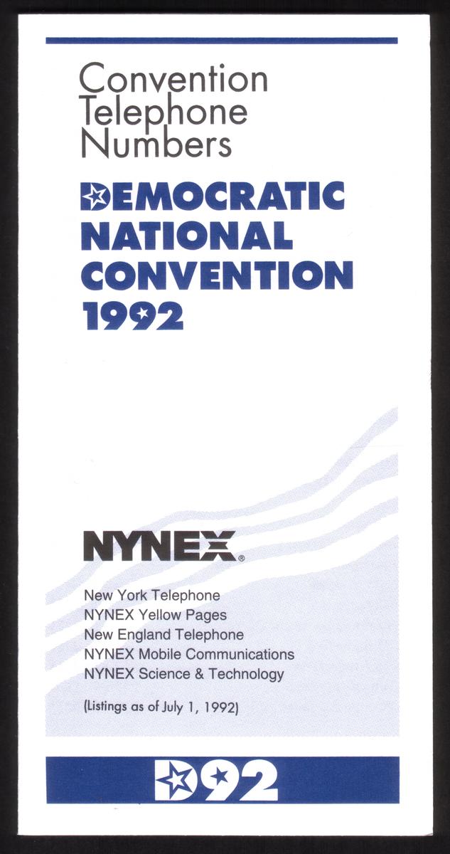 Collection of 1992 Democratic National Convention memorabilia including a New York skyline change card, patriotic flyer, convention phone numbers brochure, and guide booklet. |