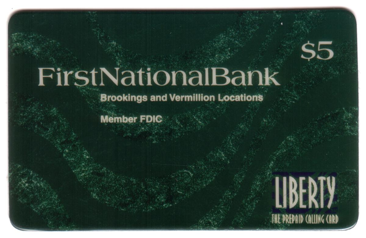 The card design includes the First National Bank name prominently, demonstrating its affiliation with financial institutions. The inclusion of Brookings and Vermillion explicitly ties the card to these geographic locations. The card is valued at $5, reinforcing its role in financial transactions or promotions connected to the bank.