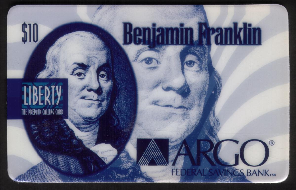 The front of the card presents Benjamin Franklin’s portrait, which is a well-known historical figure linked with American history and finance, consistent with ARGO Federal Savings Bank’s branding. The card’s design incorporates clean text layout emphasizing the issuing bank and financial value. The bank’s name “ARGO Federal Savings Bank” appears prominently, linking the card directly to a recognized savings and loan company.