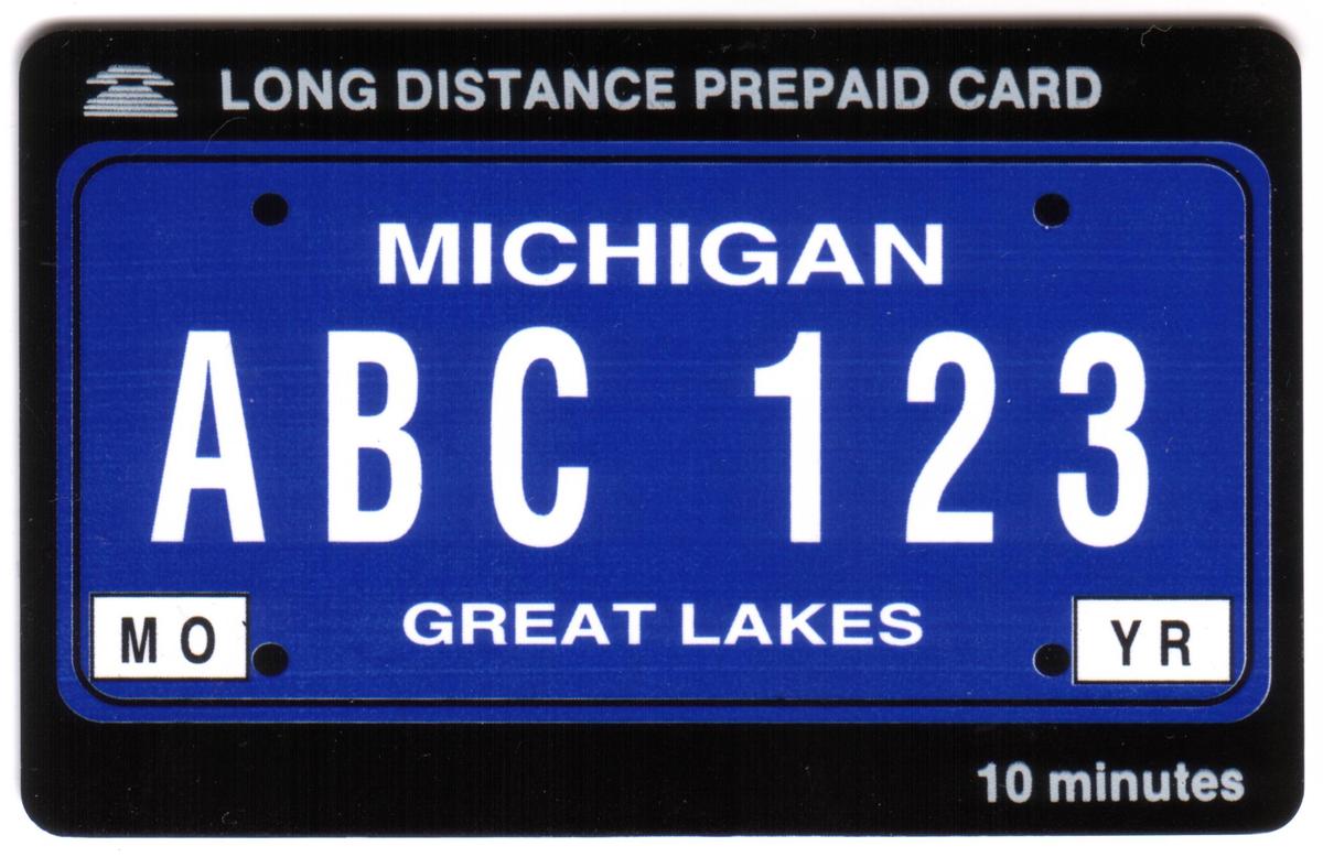 This collectible phone card features a blue and white design inspired by a Michigan license plate, emphasizing the theme of the Great Lakes. The card prominently displays the word "MICHIGAN" in bold uppercase letters near the center-right area. Above this, the phrase "The Great Lakes State" is printed in a smaller font, reinforcing Michigan’s renowned nickname. The color scheme includes various shades of blue, highlighting the water and lake motifs that connect to Michigan's geographic identity within the Midwestern United States.
