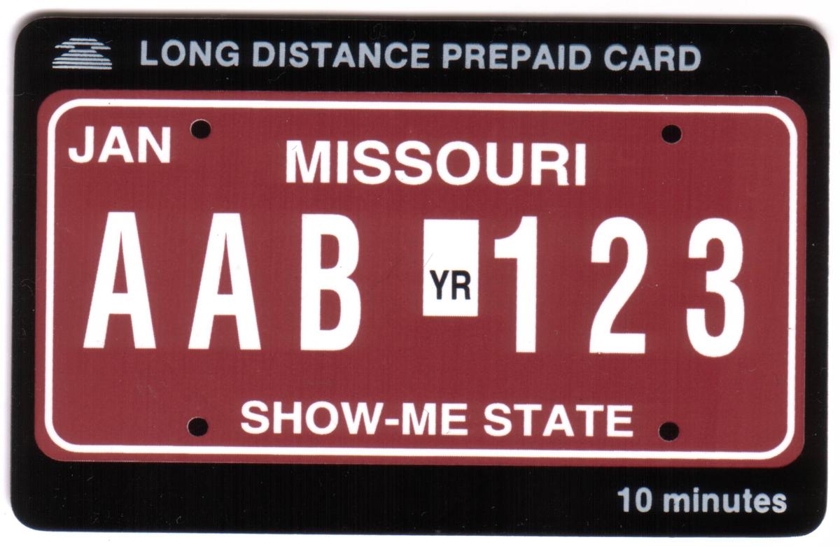 This collectible phone card features a full-color image of a Missouri license plate prominently displayed against a bright yellow background. The license plate reads "MISSOURI" at the top and includes the state’s slogan, "SHOW ME," in large, bold red letters across the center. The design also highlights a panther silhouette in black on the left side of the plate, symbolizing the state’s nickname. The words "10m" appear in the lower right corner, indicating the card’s value or minutes.