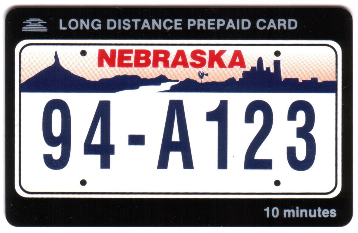 This collectible phone card features a stylized blue and white outline of the skyline of Nebraska, representing a view commonly associated with the Midwestern United States. The card is themed around Americana and automotive culture, integrating iconic elements linked to Nebraska. At the top center, the text reads "Nebraska" in blue letters, and beneath the skyline outline is the text "10m" indicating the card’s phone value.