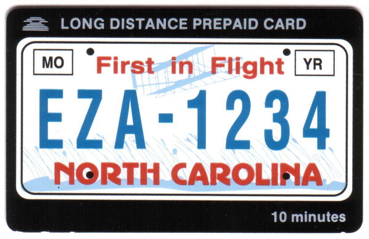 Overall, this phone card is a collectible item that celebrates North Carolina’s aviation milestone with an authentic license plate style and the iconic "First In Flight" slogan framed by the biplane outline. It links to themes of automotive and aeronautical Americana from the South Eastern United States, making it a notable piece for collectors interested in US history, aircraft, and license plates.