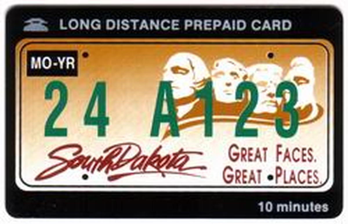 The card’s layout includes subtle graphic elements such as a stylized license plate motif that frames the image, connecting the visual to the concept of South Dakota license plates. The overall presentation honors an important national monument and symbol of American heritage, designed as a collectible phone card for enthusiasts of sightseeing and Americana themes.