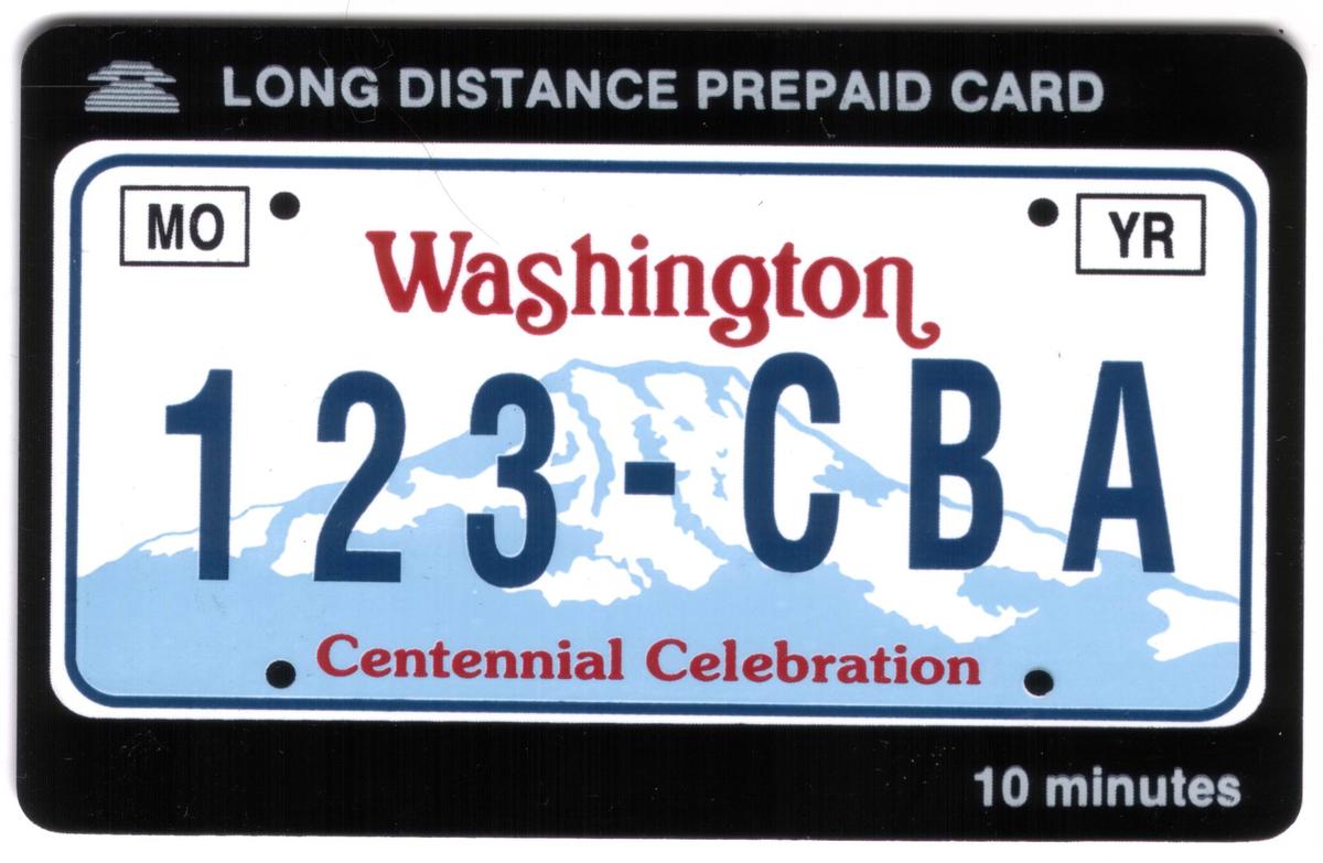 Overall, the card is a collectible phone card used within the United States and clearly honors Washington State with its centennial-themed license plate graphic. The card combines elements of Americana, Northwestern United States geography, and vintage license plate artwork, making it a distinctive piece for collectors interested in regional and historical motifs.