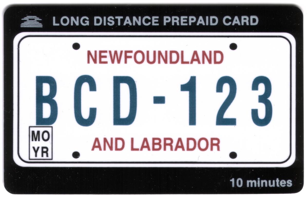 Overall, this 10m Newfoundland & Labrador phone card represents a collectible tribute to Canadian automobile registration plates with a distinctive panther motif and provincial branding, issued by WorldCom.