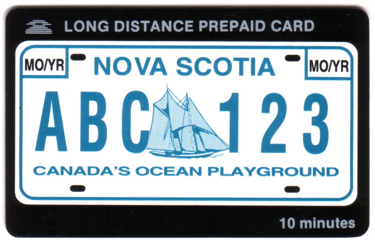 This collectible phone card features a Canadian theme with a detailed depiction of the Nova Scotia license plate design. The artwork displays a small sailboat sailing on calm waters, emphasizing the nautical aspect of Nova Scotia, which is known as the "Ocean Playground." The license plate includes the text "Nova Scotia" along the top and "Ocean Playground" at the bottom, reinforcing the coastal and maritime identity of this Canadian province.