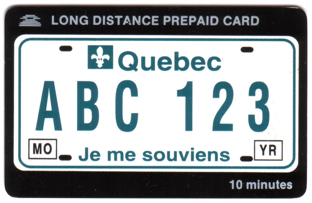 This collectible phone card features a detailed image of a Quebec (Canada) license plate. The license plate displays the phrase "Je me souviens," which is the official motto of Quebec. The design includes the iconic Fleur-de-lis symbol, which is strongly associated with Quebec’s heritage and French culture. The card is denominated for 10 minutes of phone use.