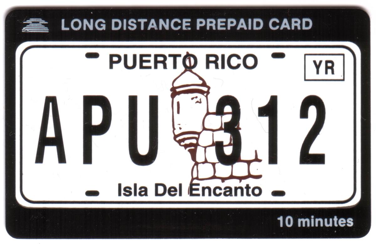 The card is a 10-meter phone card issued by Panther Precious Metal. The layout includes a license plate motif, with the phrase "Puerto Rico" clearly displayed. The card reflects themes linked to US license plates, tying into the broader category of American territories and their distinctive elements.