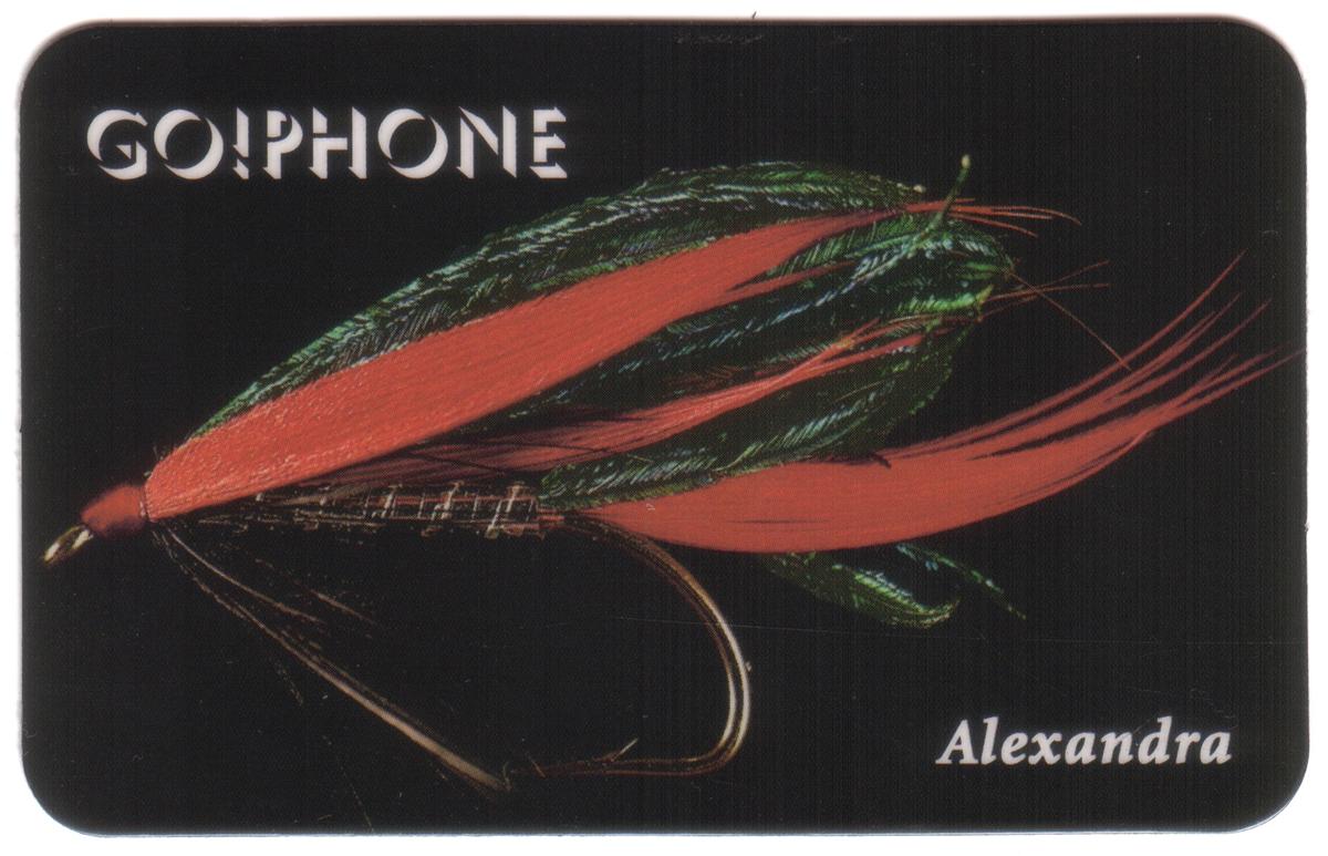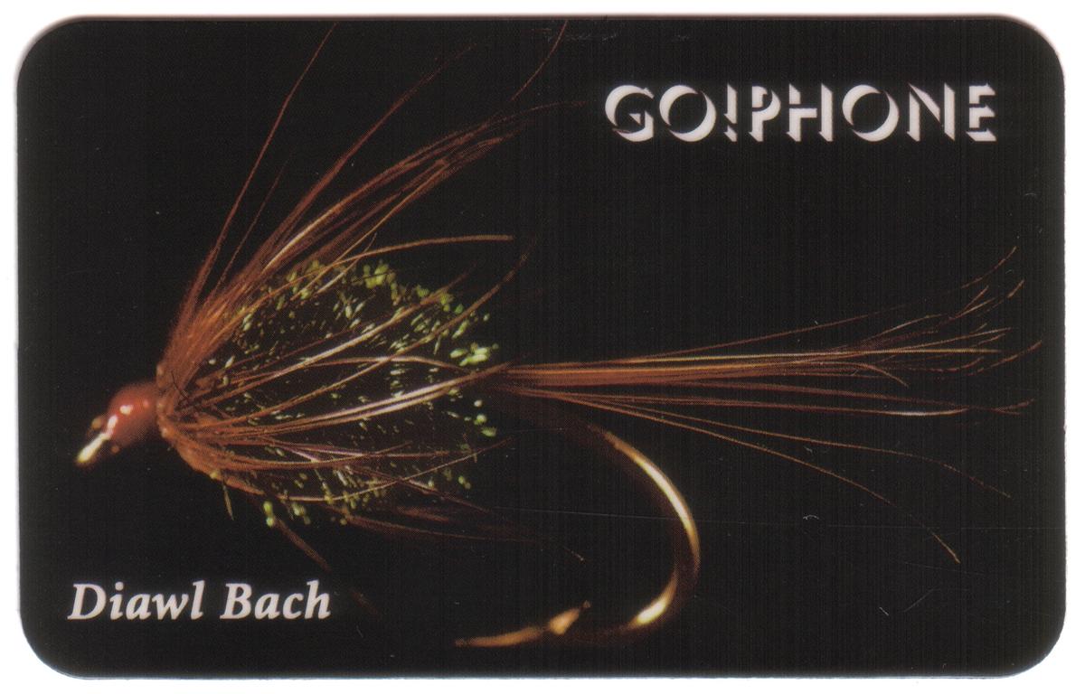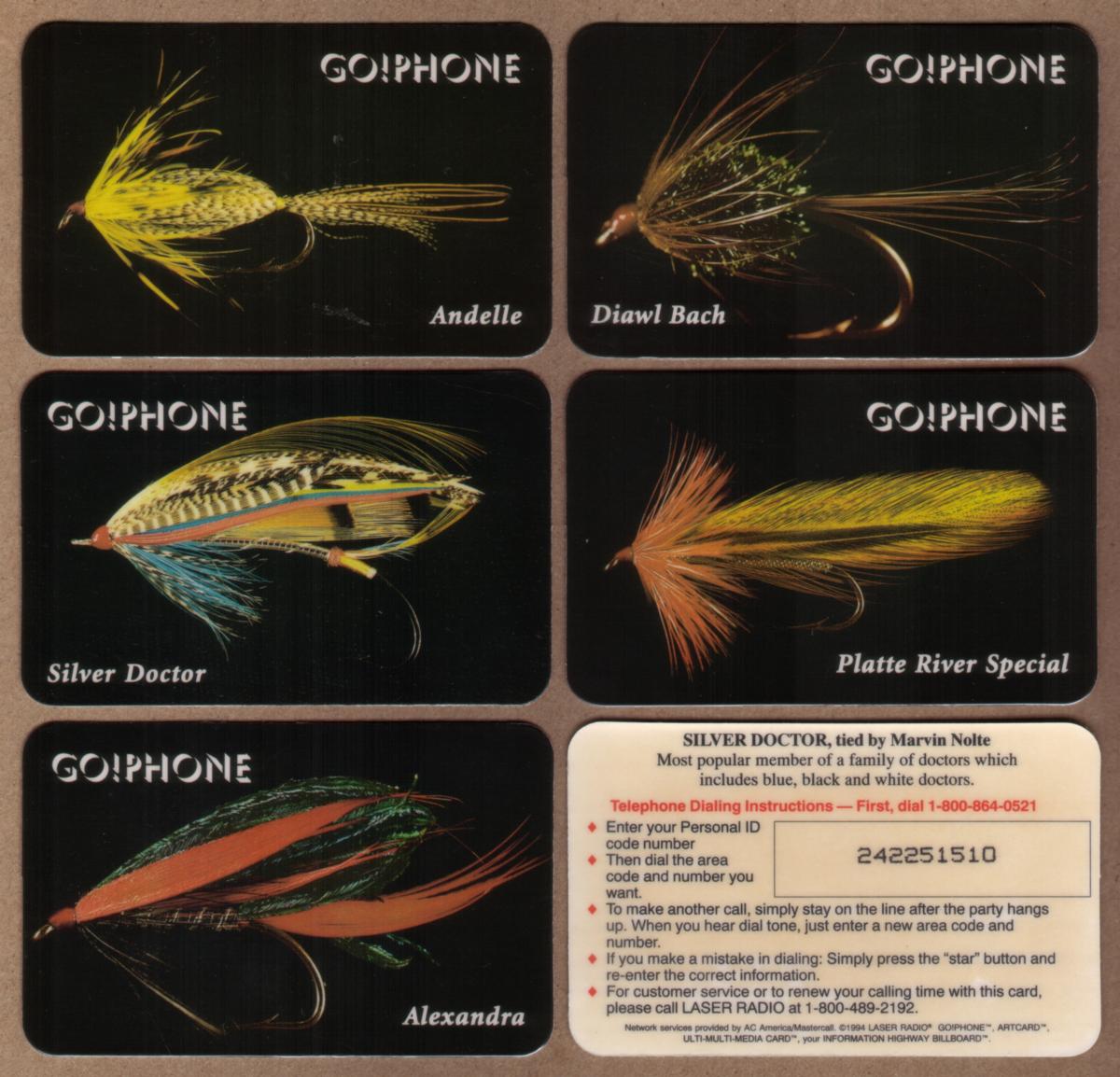 These five collectible Go! Phone cards each feature a detailed, high-quality image of a traditional fly fishing lure against a black background. Each card prominently displays the "GO!PHONE" logo in the upper right corner and the name of the specific fishing fly in white text at the bottom left or right.