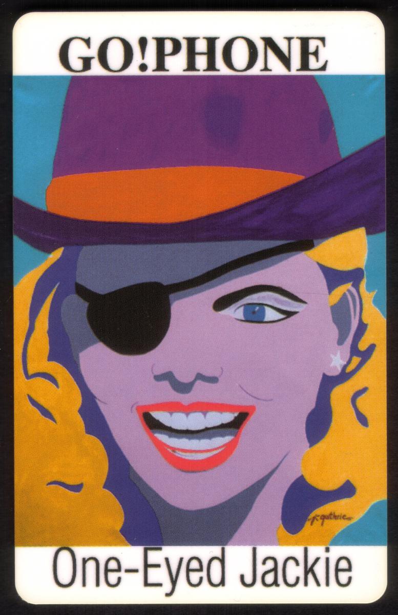 The card includes the text "One-Eyed Jackie (ATI Telecom) GoPhone" and "Laser Radio," indicating its association with the GoPhone service by ATI Telecom. The branding is clearly visible and integrated into the design, emphasizing the card’s function as a GoPhone collectible. The layout balances the artwork and text elements effectively, with the woman positioned prominently to draw attention.