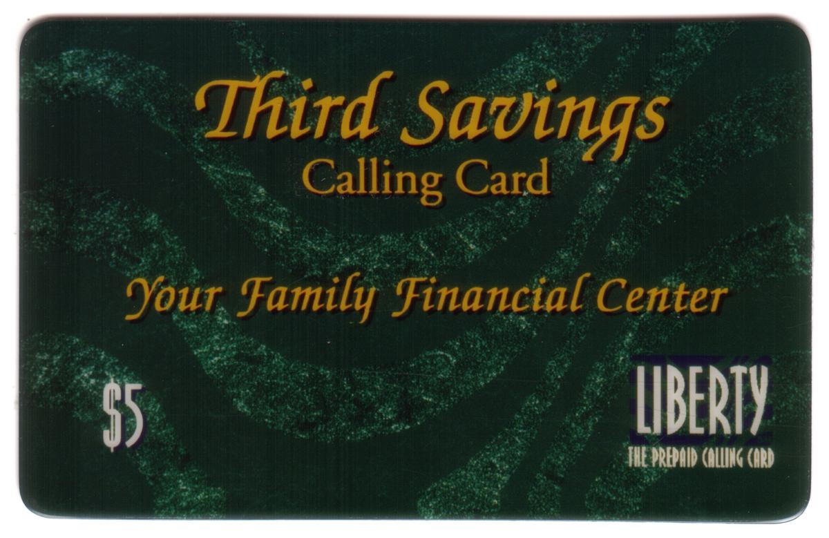 Third Savings prepaid card with $5 value, green textured background, gold logo, and Liberty branding, emphasizing trust, savings, and reliable communication. |