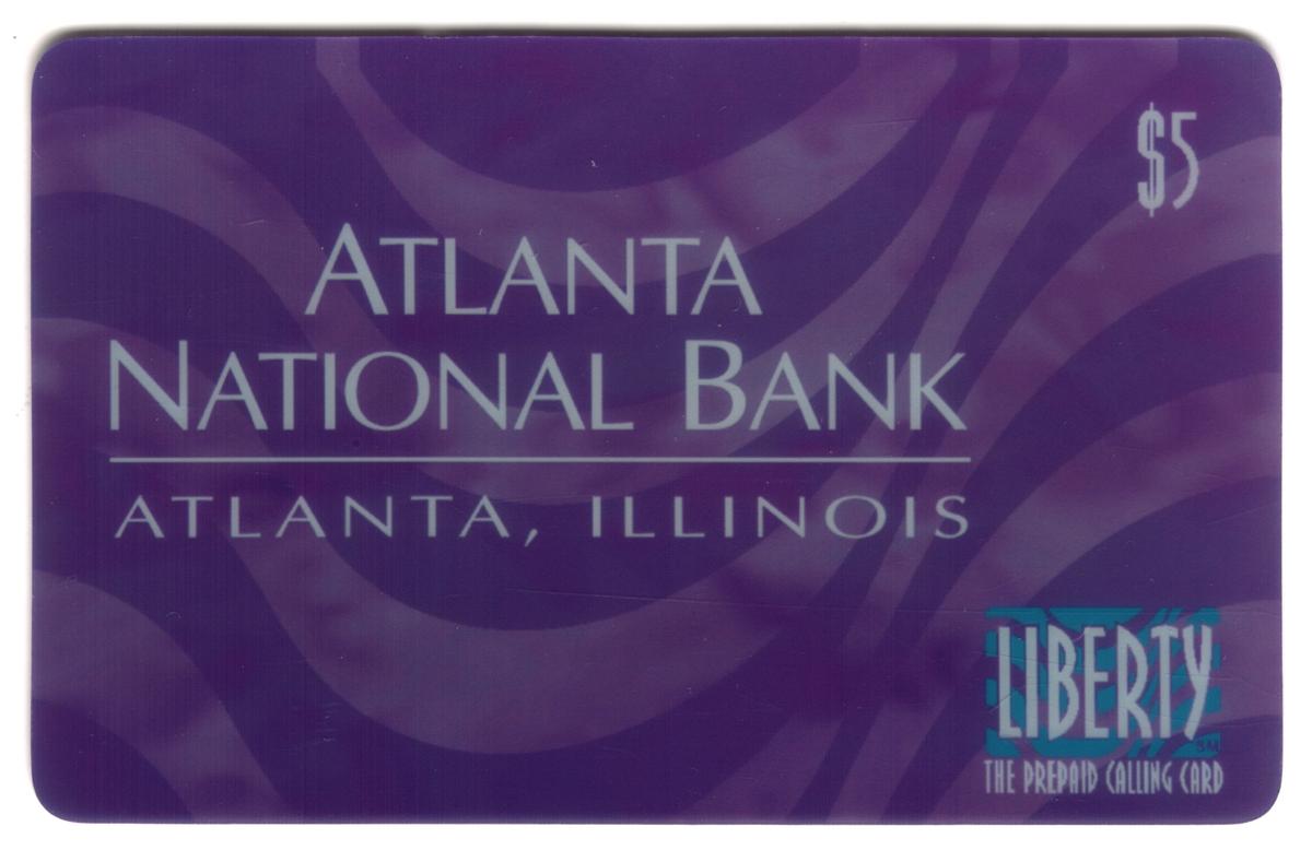 Deep purple prepaid card featuring Atlanta National Bank branding, $5 value, Liberty logo, and a subtle swirling pattern for a professional, reliable look. |