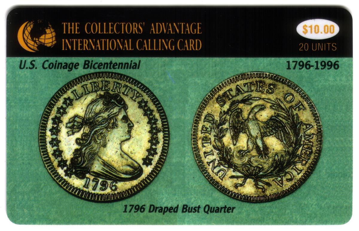 This collectible phone card features the image of a 1796 Draped Bust Quarter, part of U.S. coinage bicentennial currency. The quarter displayed on the card is detailed, showing the classic Draped Bust design with the head of Liberty on the obverse side, surrounded by stars and the year 1796. The coin's depiction reflects early American numismatic artistry, emphasizing historical significance in the realm of U.S. currency.