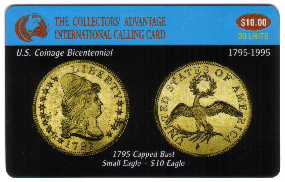 Text on the card includes references to "Mercury Marketing," dated "10/94," indicating the production or release date. The card prominently displays the title "1795 Capped Bust Small Eagle $10 Gold Coin (Bicentennial)," confirming its significance in numismatics and gold coin collecting. Other text on the card reinforces its connection to coin collecting, currency, and numismatic interests, alongside keywords like "the collectors' advantage" and "money."