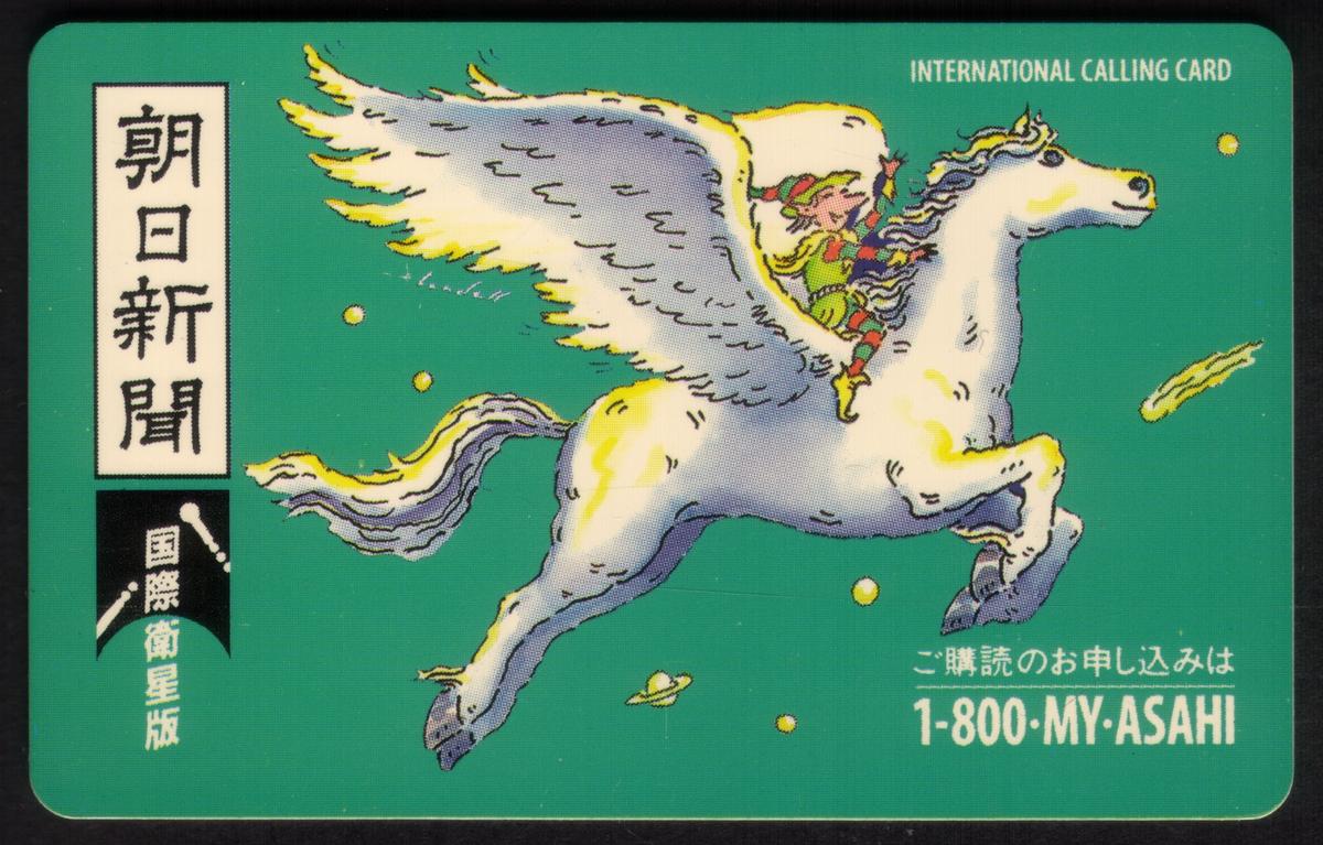 The card’s denomination is $10, as indicated on the front, and it also features the title "Asahi Newspaper (Winged Horse Design)." The overall style blends elements of equestrianism, fantasy art, and Japanese cultural motifs, resulting in a visually striking collectible item. The presence of the planetary symbols and mythological creatures makes this card unique among collectible phone cards.