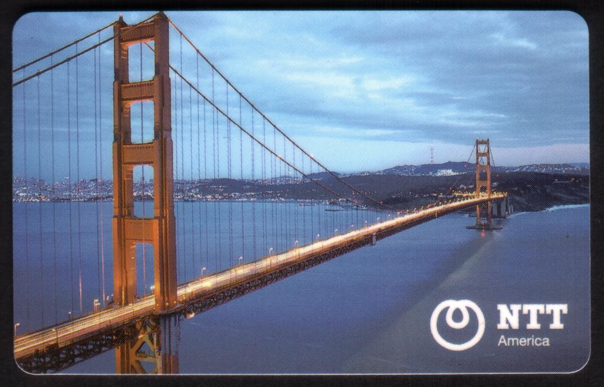 The card includes the denomination “25u” which indicates the unit value for phone use. Text on the card clearly identifies it as related to San Francisco, CA, with “San Francisco’s Golden Gate Bridge” prominently displayed. The card also features the “NTT” logo, referencing the Japanese telecommunications company, and the word “America” appears in the design, underlining the geographic and national significance.
