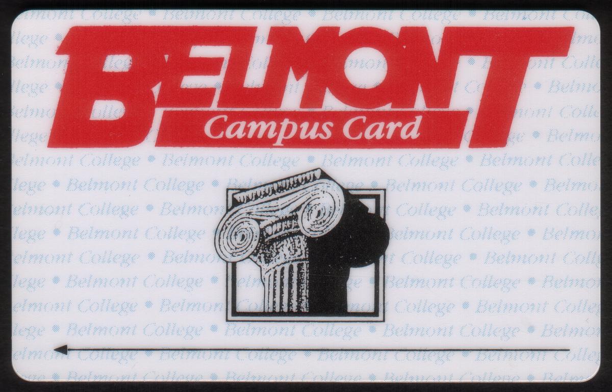This card is part of a series of user cards used by colleges and universities, featuring college emblems and university branding. It contains a magnetic stripe and serves as a collectible item tied to Belmont College’s campus identity.