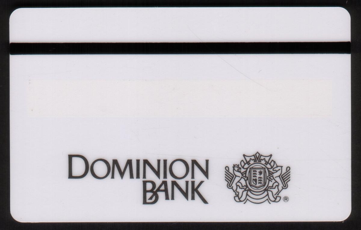The background of the card is white with a repeating pattern of the words "Belmont College" in a subtle, light blue font. A small black arrow is located near the bottom edge of the card, pointing to the left. The card is linked to Dominion Bank and BellSouth Telecom, as indicated by the keywords associated with this item.