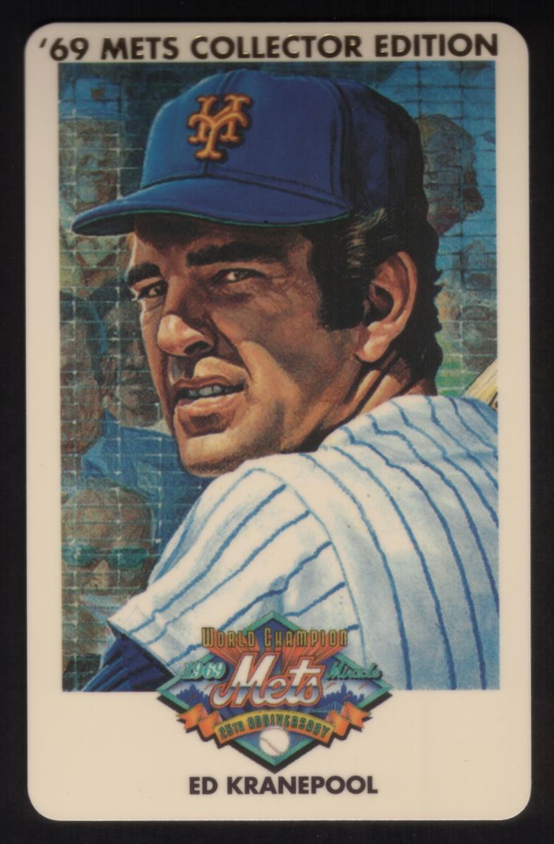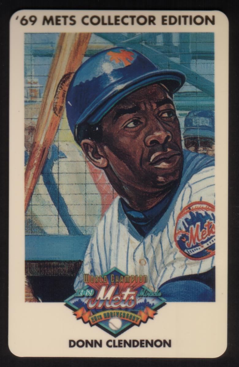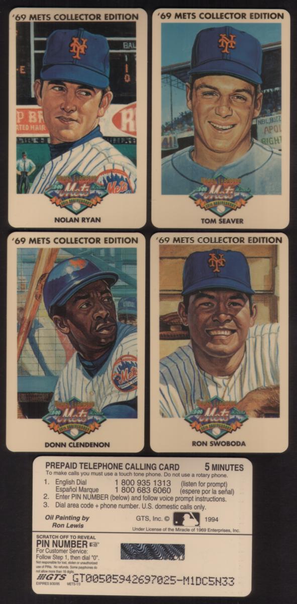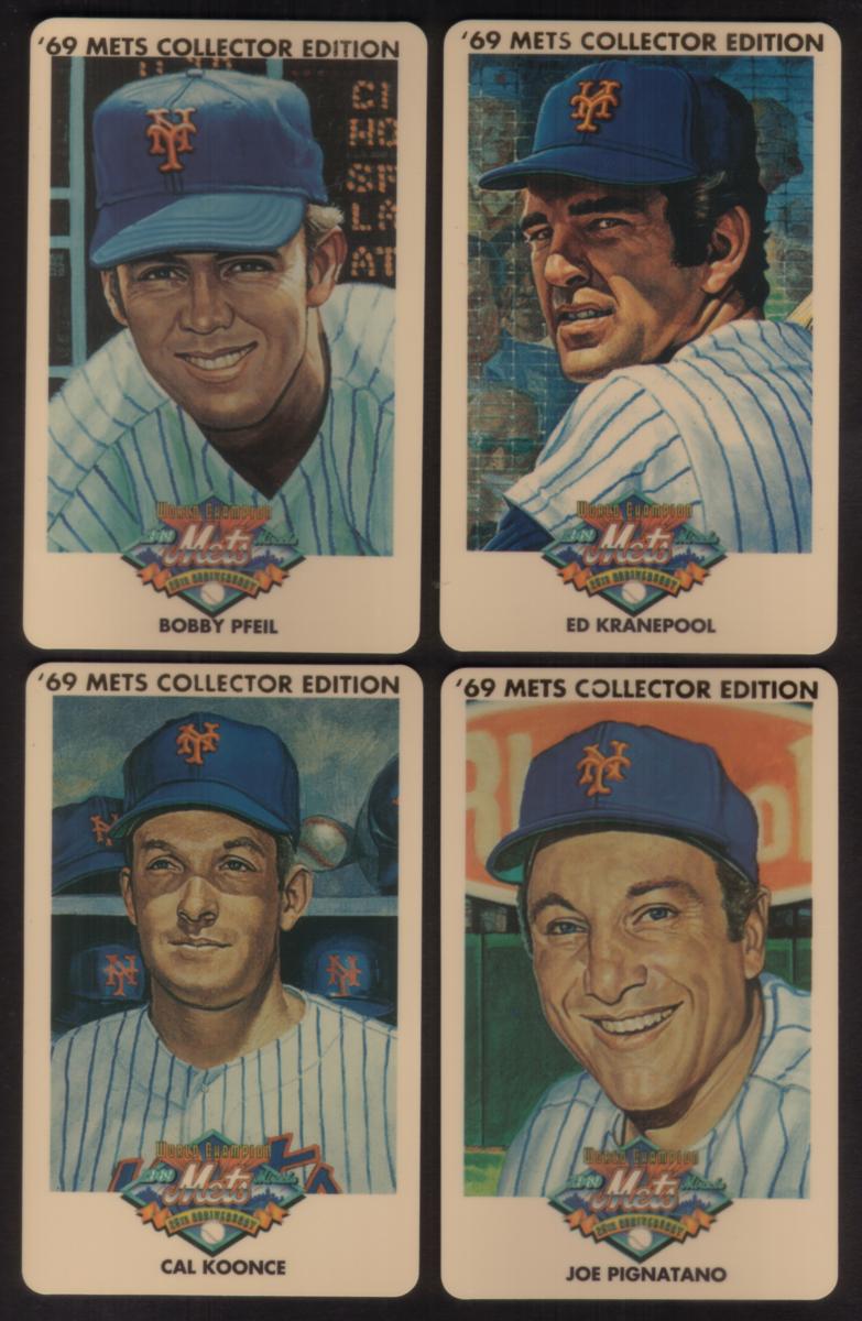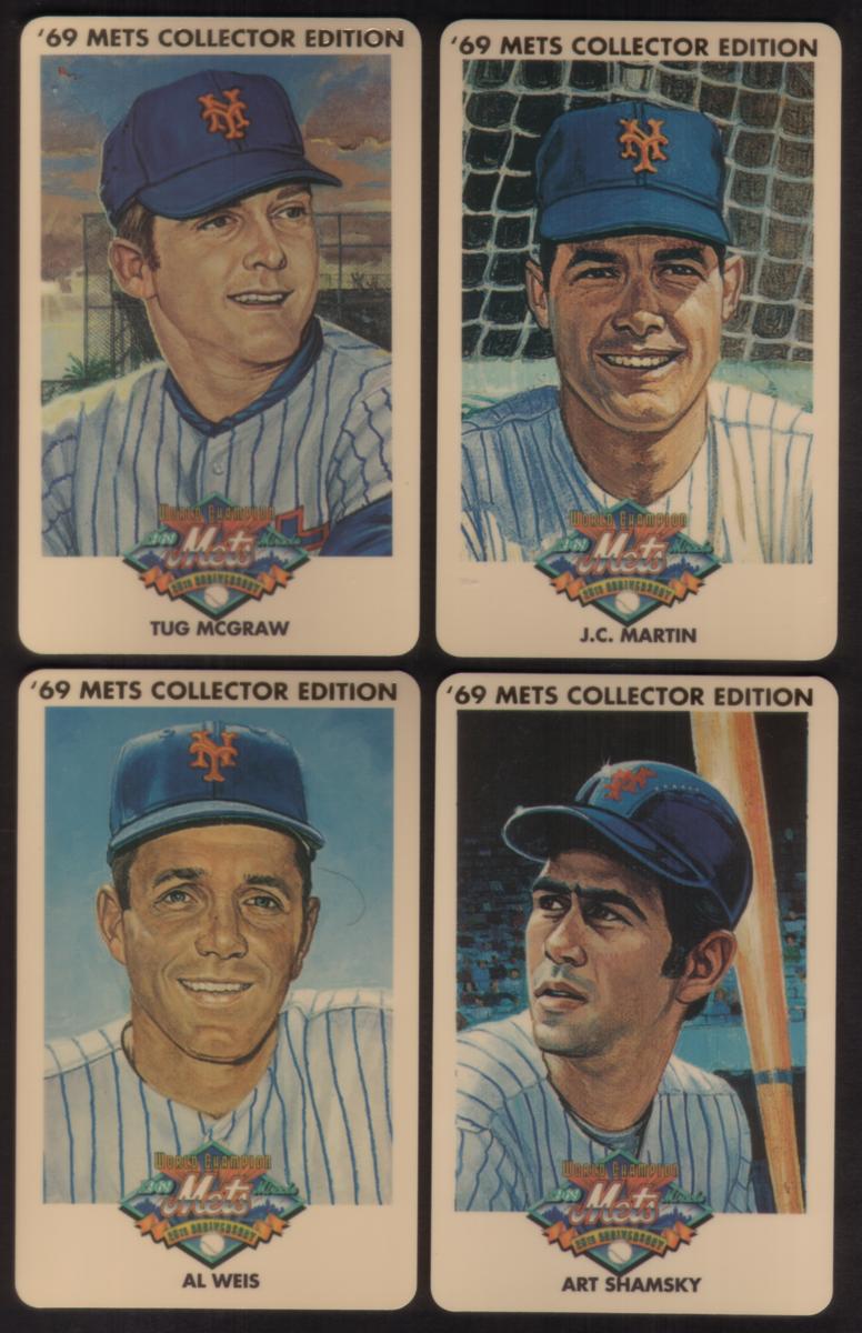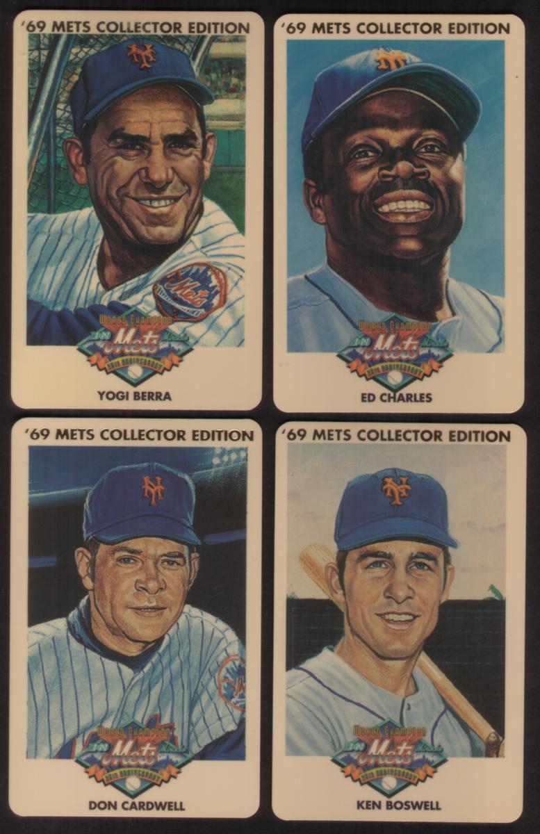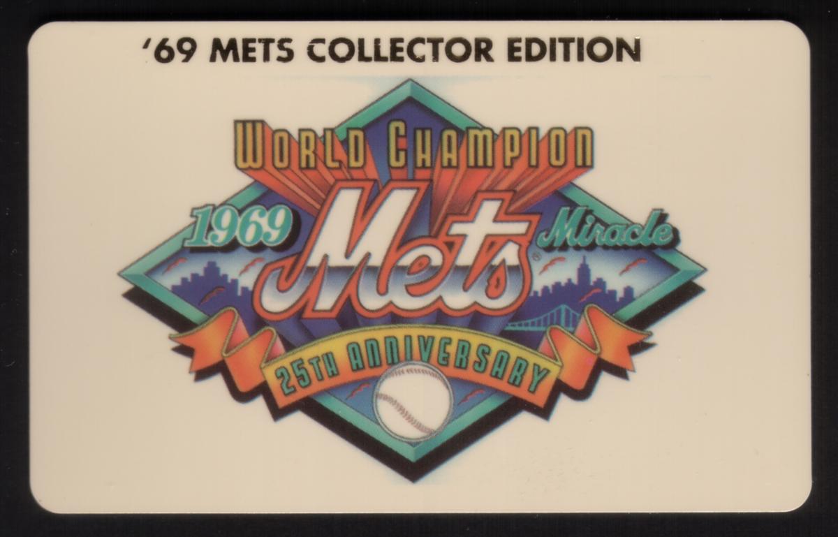 This collection features 1969 Mets Collector Edition collectible phone cards celebrating the 1969 New York Mets baseball team's 25th Anniversary and World Champion status. Each card includes a detailed illustration of a baseball player or coach associated with the Mets, depicted in a variety of poses mostly wearing Mets caps and pinstriped uniforms. Every card has the title "'69 METS COLLECTOR EDITION" at the top and the name of the featured individual printed at the bottom. The Mets logo is incorporated in the graphic design on each card, along with a colorful emblem that reads "World Champion 1969 Mets Miracle 25th Anniversary."