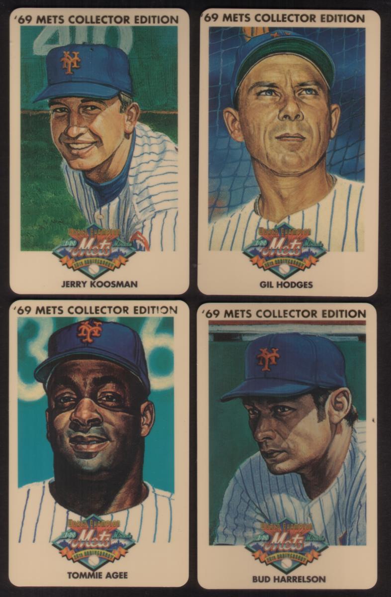 The cards are part of a sports-themed major league baseball collectible series associated with the 1969 Miracle Mets, linking to the Meineke Muffler promotional set of 32 cards. The artwork style is consistent across the set, capturing the likenesses with vivid, realistic illustrations that bring focus to each Mets figure's facial features and uniform insignia. This collection is designed to honor the historical achievement of the Mets and the individual contributions of the team's players and coaching staff during that landmark season.