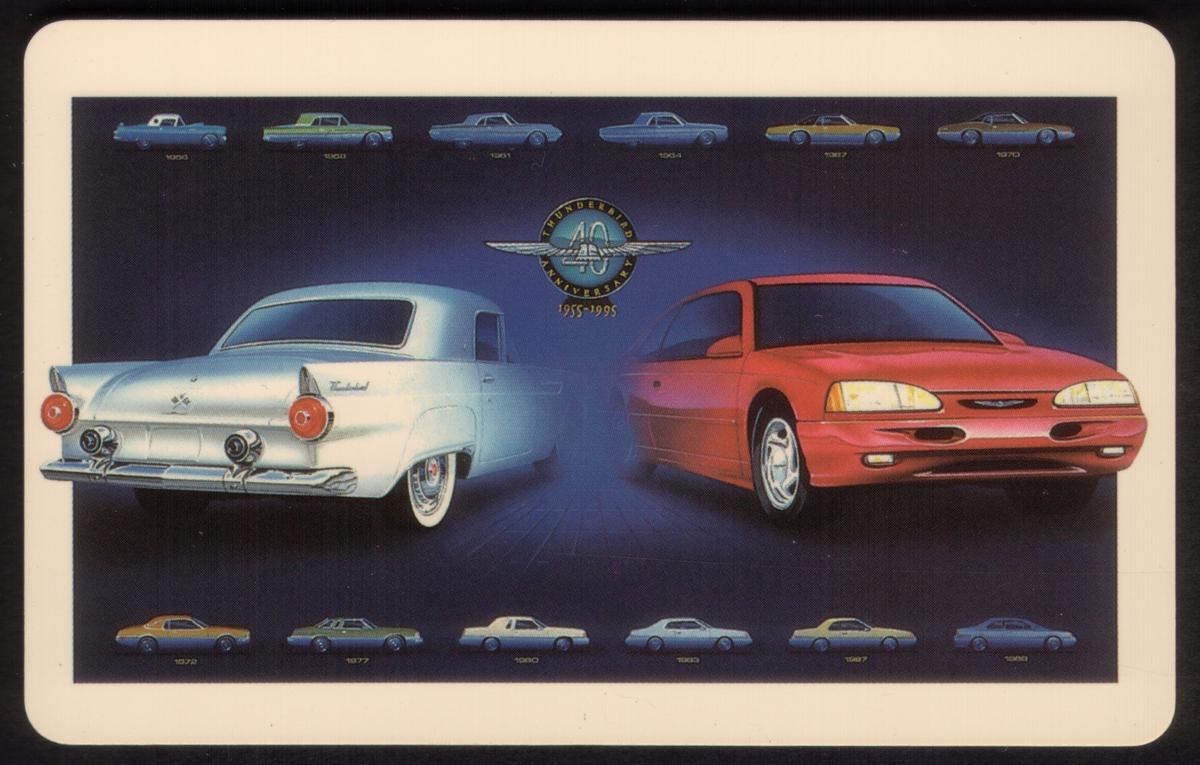 This collectible phone card commemorates the 40th Anniversary of the Ford Thunderbird, featuring iconic imagery from two distinct years: 1955 and 1995. The card highlights the renowned American automobile with two detailed photographic images: the 1955 Thunderbird and the 1995 Thunderbird. Both cars represent classic Americana and automotive history, emphasizing the evolution of this legendary model over four decades.