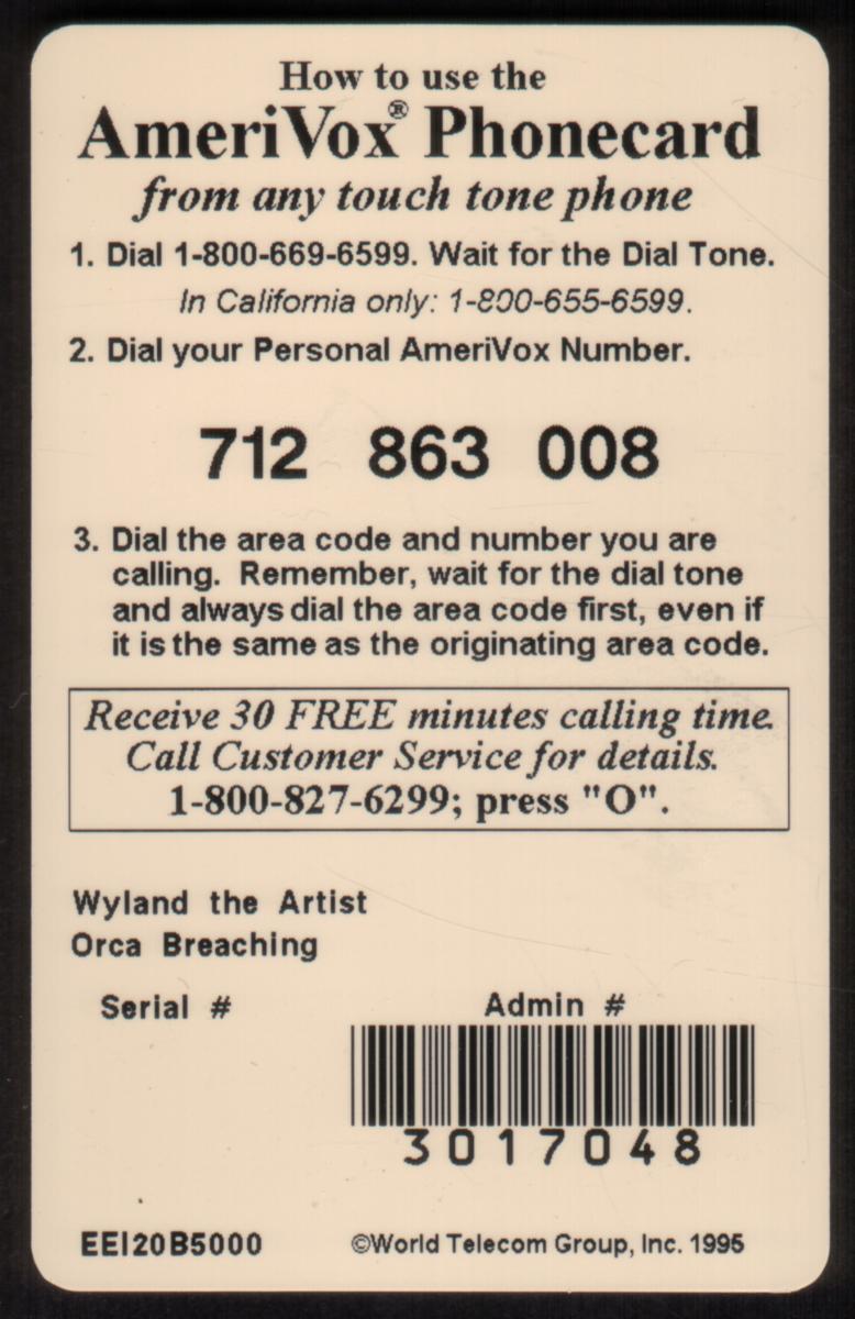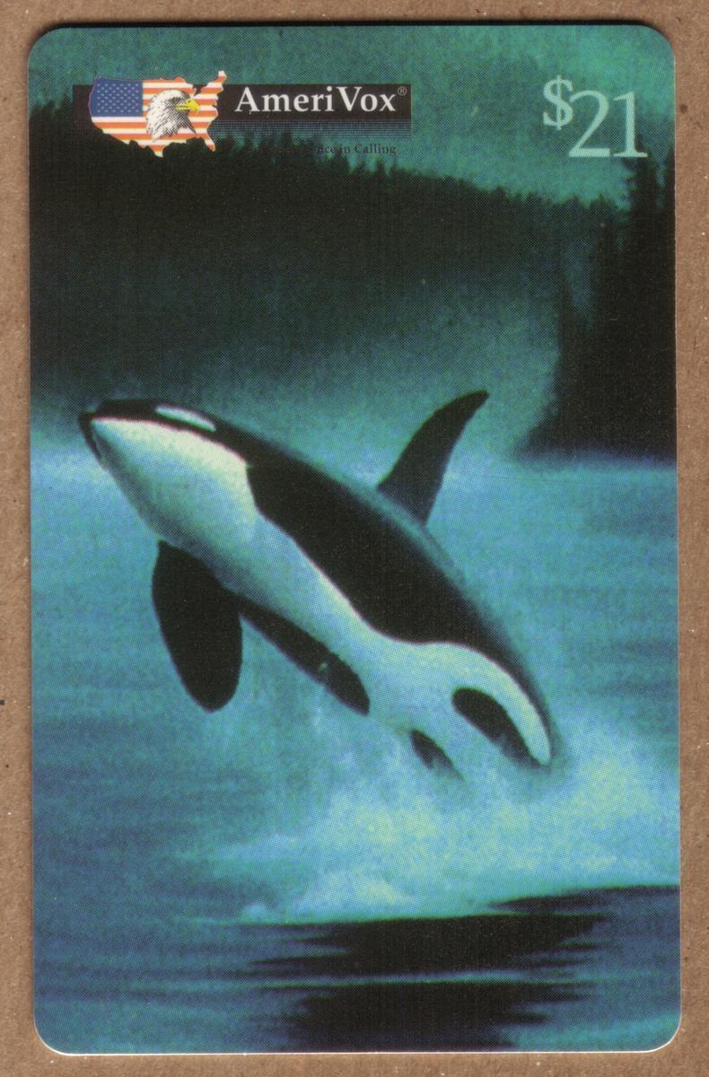 This collectible phone card from AmeriVox features a detailed image of an orca whale breaching out of the water. The scene captures the orca mid-air with water splashing below its body, emphasizing the dynamic movement. The background includes a blue-green gradient likely depicting a natural aquatic environment.